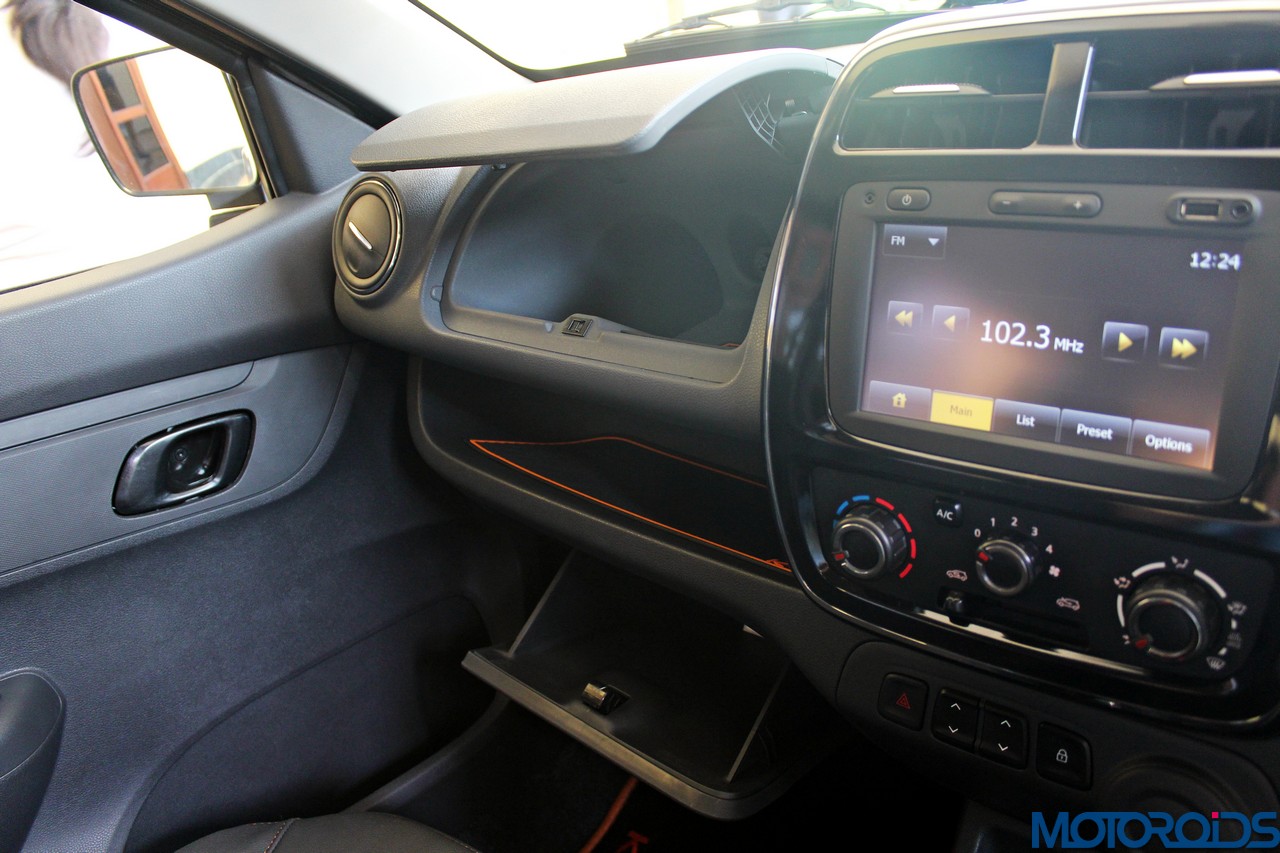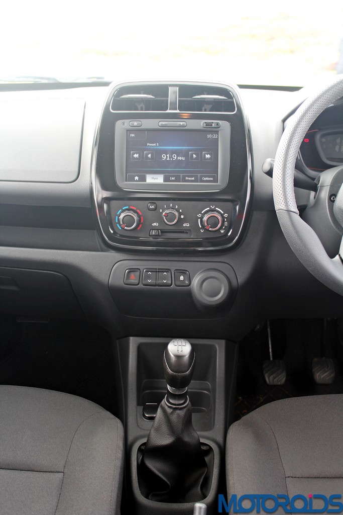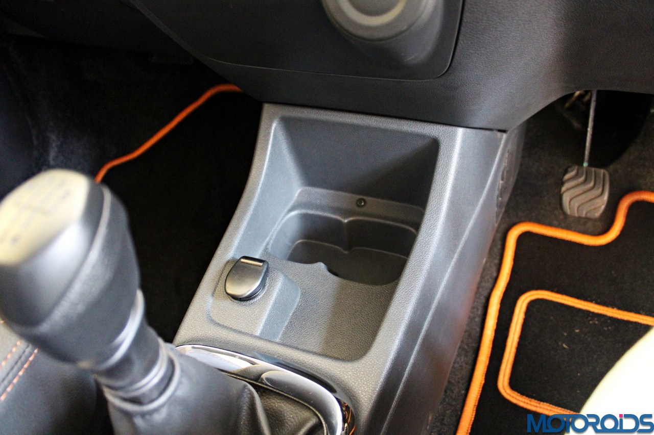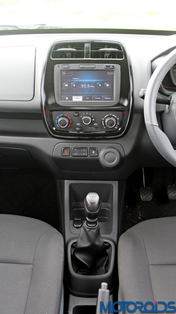 The dashboard design is clean and uncluttered, something, which Renault says opens up more storage spaces – the Kwid has as much as 22.4 litres of storage space, a class leading figure aided by not one or two, but three glove boxes decked over one another.  Other knick-knacks can be stored in a couple of cubby holes; one below the center console and the other behind the hand brake lever. Storage wells in the front door pad easily swallow 1-litre bottles, while the floor board is integrated with two can holders.