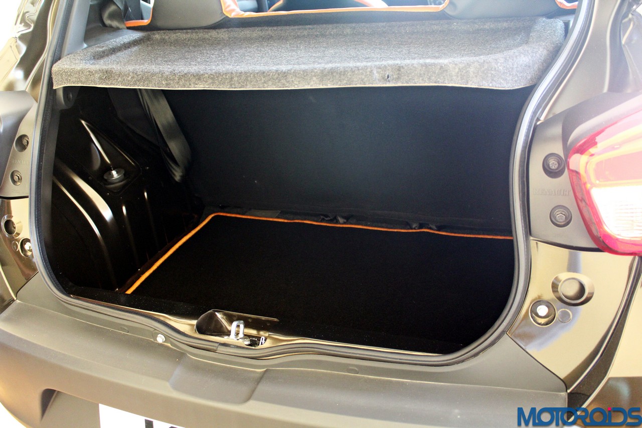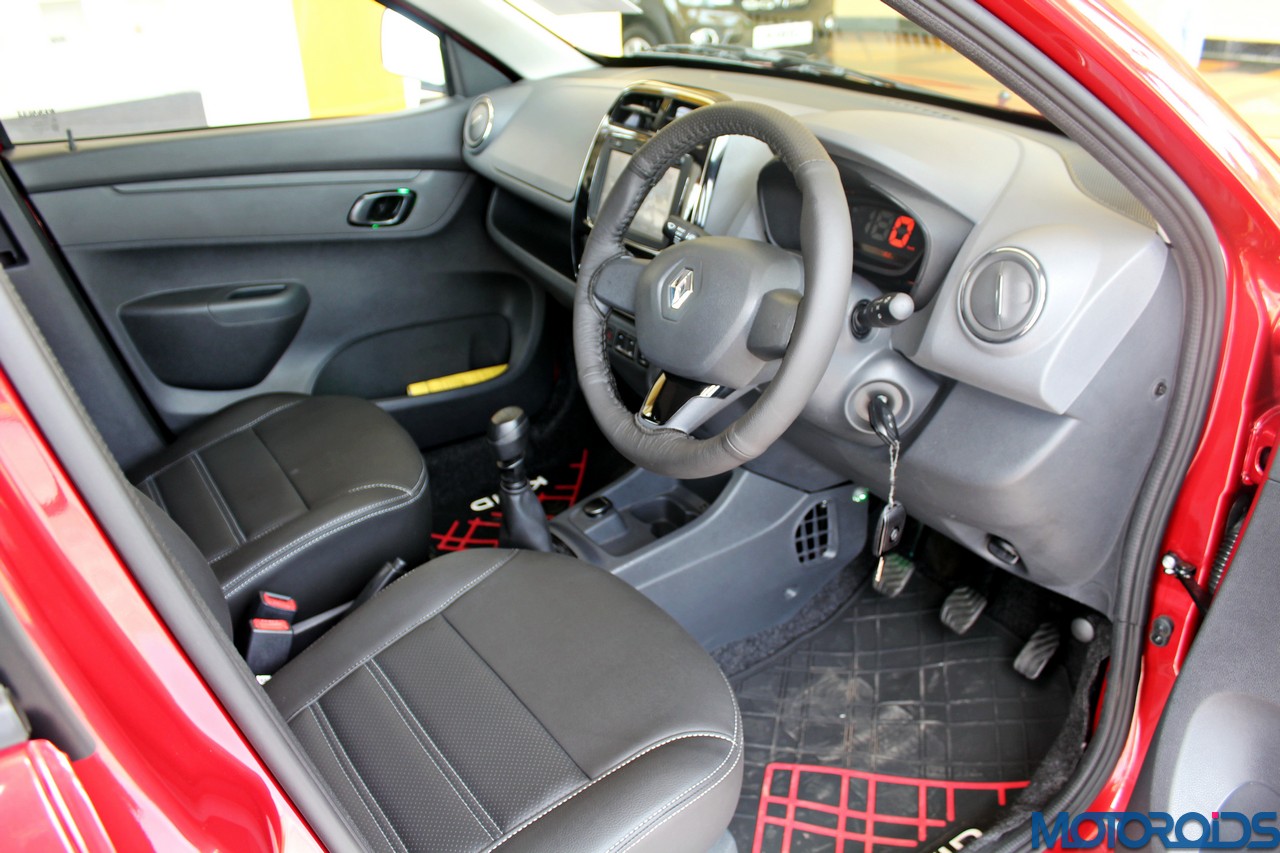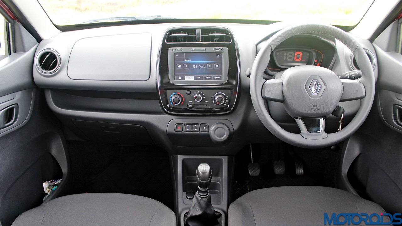 The dashboard design is clean and uncluttered, something, which Renault says opens up more storage spaces – the Kwid has as much as 22.4 litres of storage space, a class leading figure aided by not one or two, but three glove boxes decked over one another.  Other knick-knacks can be stored in a couple of cubby holes; one below the center console and the other behind the hand brake lever. Storage wells in the front door pad easily swallow 1-litre bottles, while the floor board is integrated with two can holders.