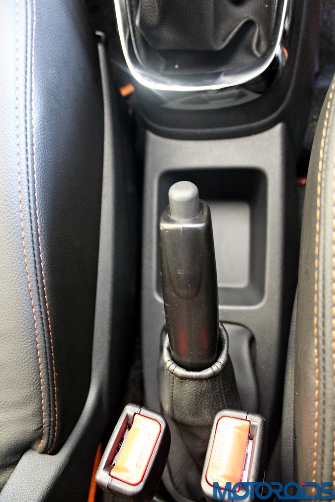 The dashboard design is clean and uncluttered, something, which Renault says opens up more storage spaces – the Kwid has as much as 22.4 litres of storage space, a class leading figure aided by not one or two, but three glove boxes decked over one another. Other knick-knacks can be stored in a couple of cubby holes; one below the center console and the other behind the hand brake lever. Storage wells in the front door pad easily swallow 1-litre bottles, while the floor board is integrated with two can holders.