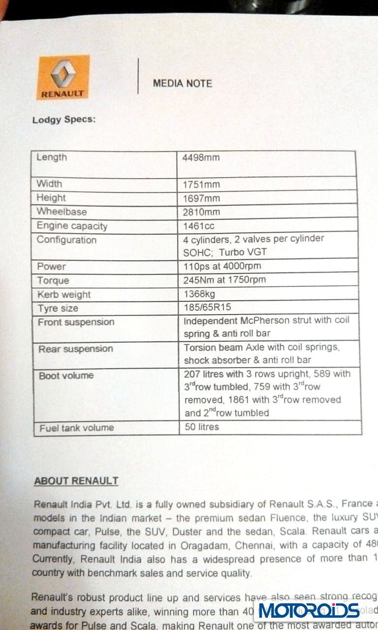 - The Lodgy is powered by a 1.5 liter dCi engine with 110PS of peak power at 4000 rpm and 245 Nm of peak torque at 1750 rpm. ARAI fuel efficiency is rated at 19.98 kmpl