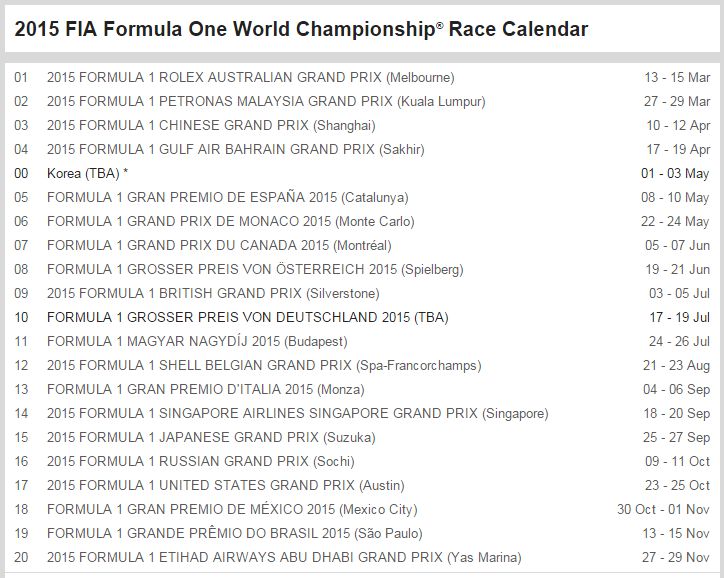 The first race of the season starts on the 13th of March with the Australian Grand Prix. Here’s the 2015 F1 Race Calendar: