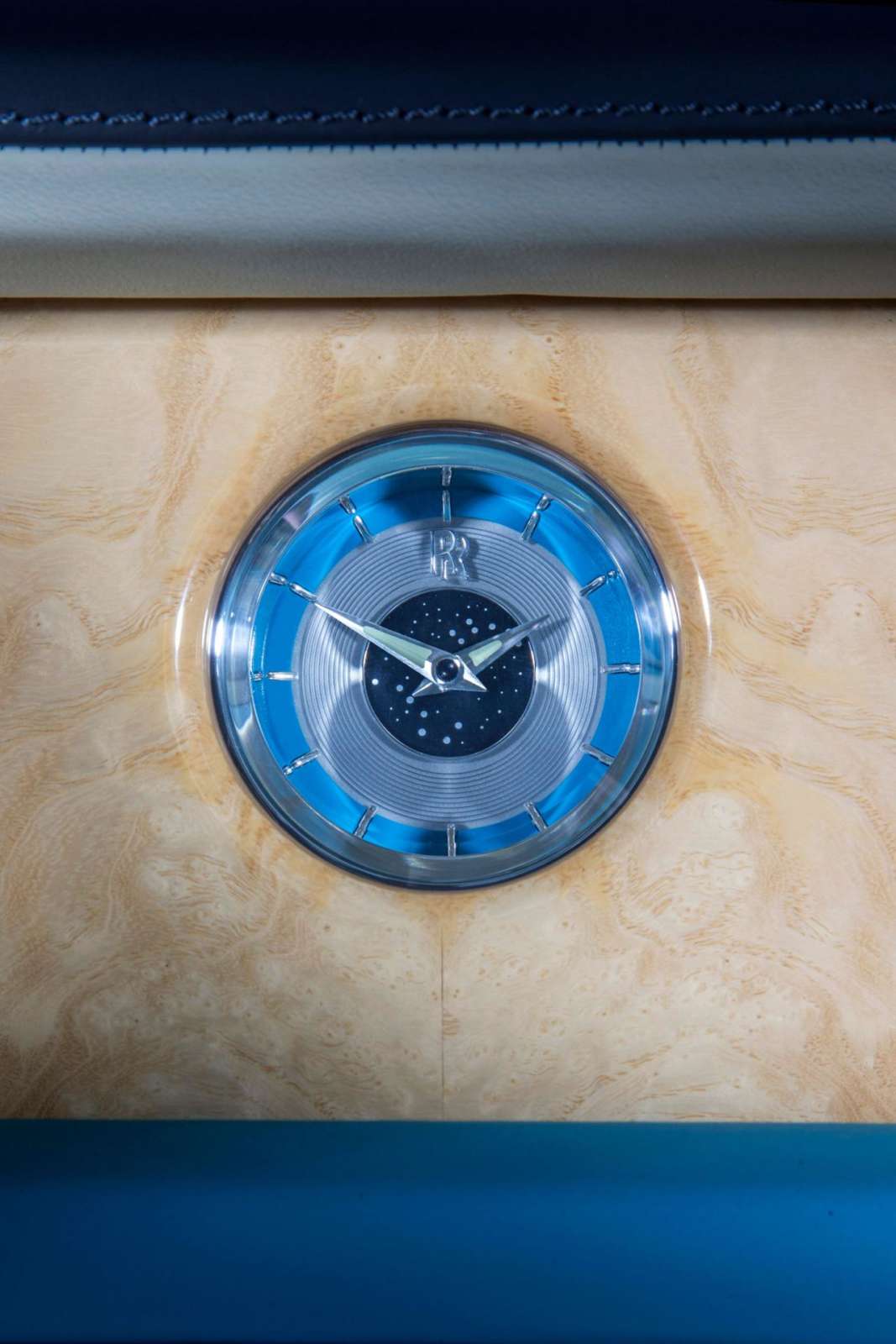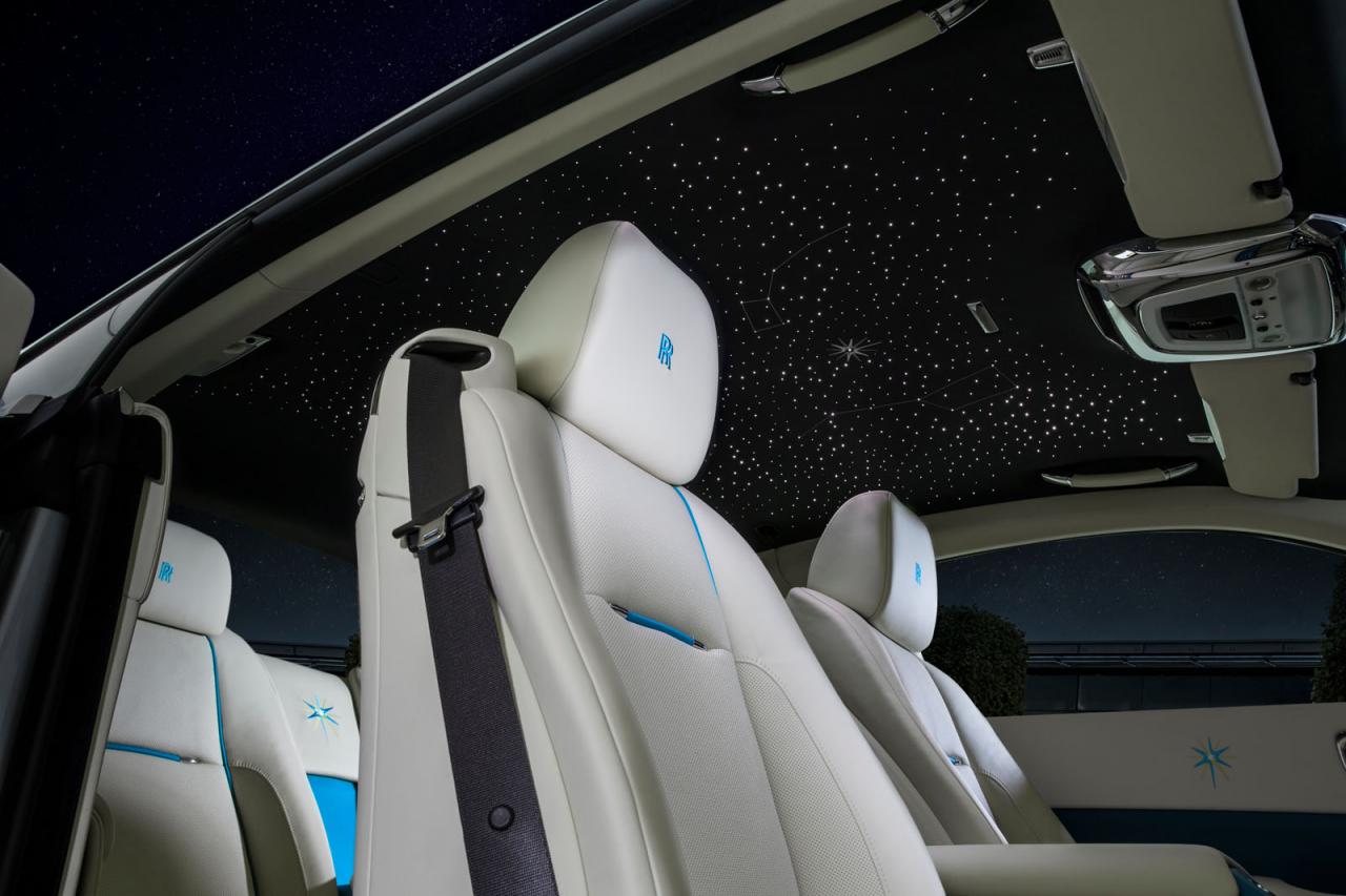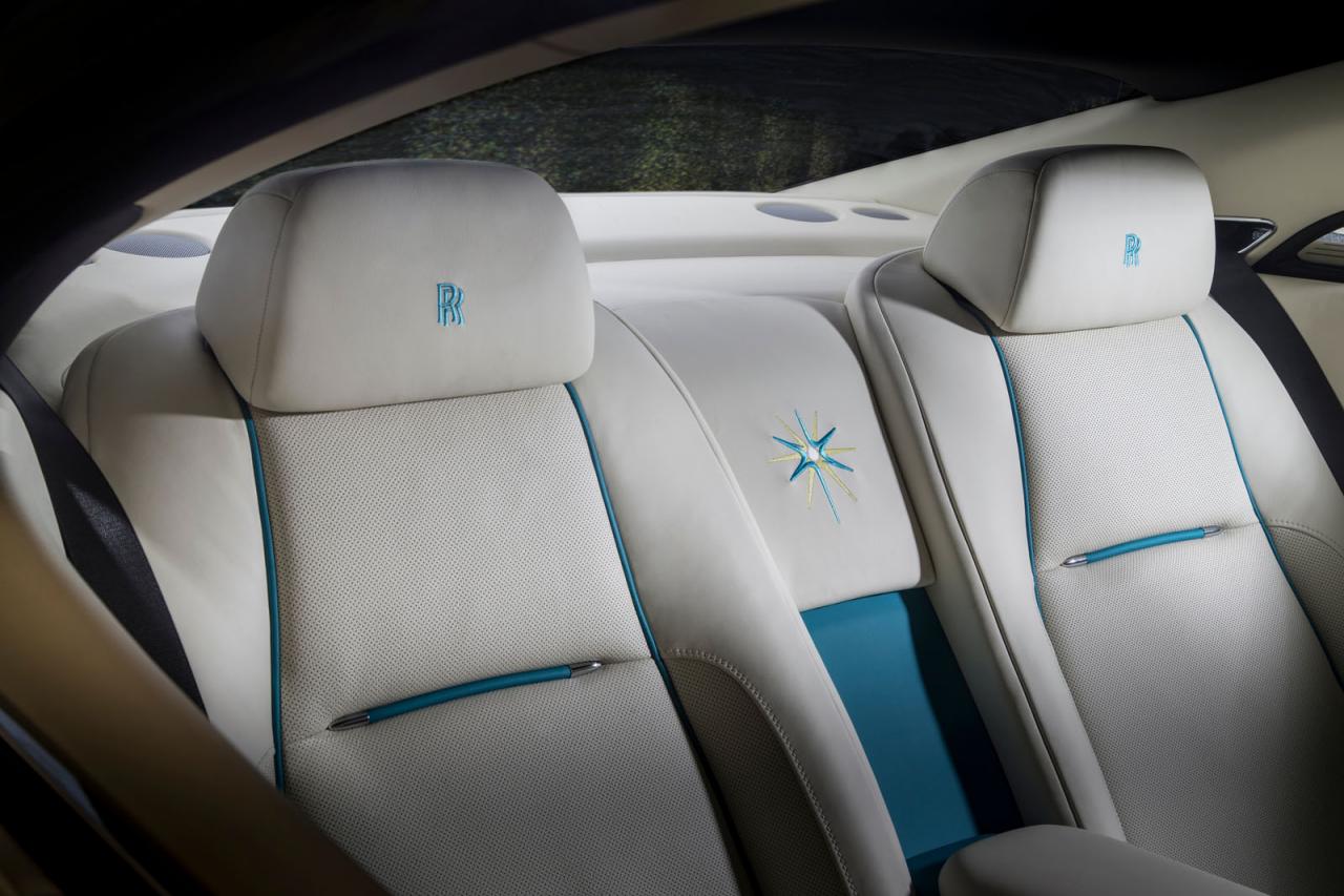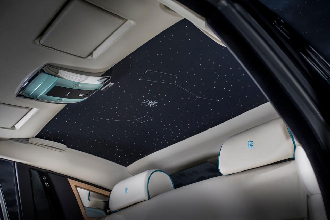 The bespoke interior continues the striking color scheme by combining Crem é Light leather with Turchese accents, framed by a Navy Blue instrument panel top and carpets. Suhail star emblems are also worked into the marquetry on the Ash Burr wood fascia, whilst a Starlight Headliner in the Phantom and Wraith models allows the owner their own personal moment of stargazing. Finally the Bespoke clock, color matched to the interior, depicts the Suhail Ursa Minor and Major constellation on the clock face.