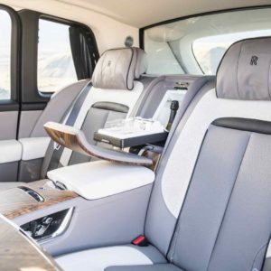 Aperitifs can be mixed in highball crystal glasses, discreetly frosted with the RR monogram, using the stowed zester, jigger, ice tongs and American Walnut muddler. A hidden compartment contains linen napkins to serve while paring knives, stainless steel drinking straws and a pepper grinder complete the set. This remarkable piece will be exhibited alongside Viewing Suite, two rear-facing, beautifully contemporary, leather chairs and a cocktail table stored in the rear compartment of Cullinan.