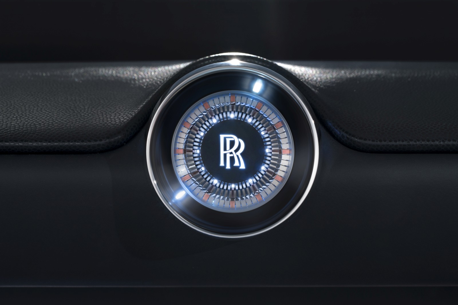 The polished metal of the grille flows up over the nose, around the base of the Spirit of Ecstasy and along the top of the suspended laser-headlight hoops, before narrowing to shoot down the side of the vehicle’s long bonnet, as a dividing line between upper and lower sections of the car. This metal feature creates a ‘horseshoe’ as it flows along the top edge of the coach door, describes a parabola up and over the pronounced rear shoulder, encircling the rear of the glass canopy and back down the other flank.