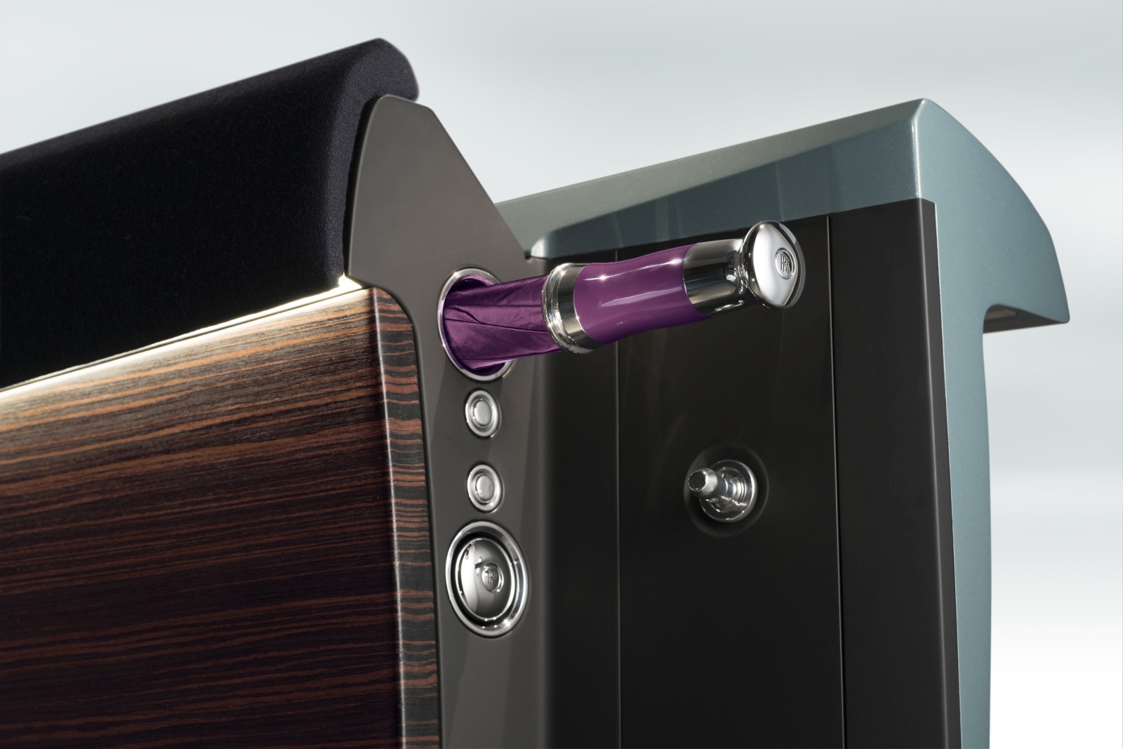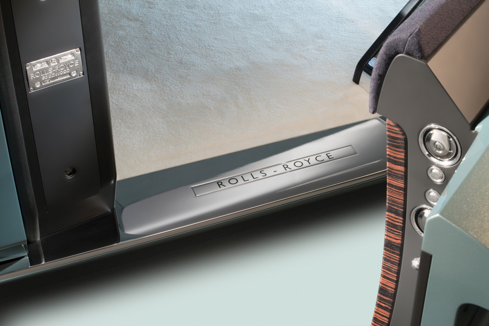 the cabin is encircled by the most modern handcrafted fine-line Macassar wood panelling, sweeping across the interior from the coach door, continuing around behind the generous OLED screen and up beside the second passenger to the side of the sofa. Inspired by the early regal Rolls-Royces, but also by the ground-breaking work executed on the 2015 Phantom Serenity, the designers used the symbol of ultimate elegance – silk – to clothe the sofa. The sense of space is accentuated as passengers’ view from their seats is uninterrupted by a cockpit or steering wheel which are now superfluous.