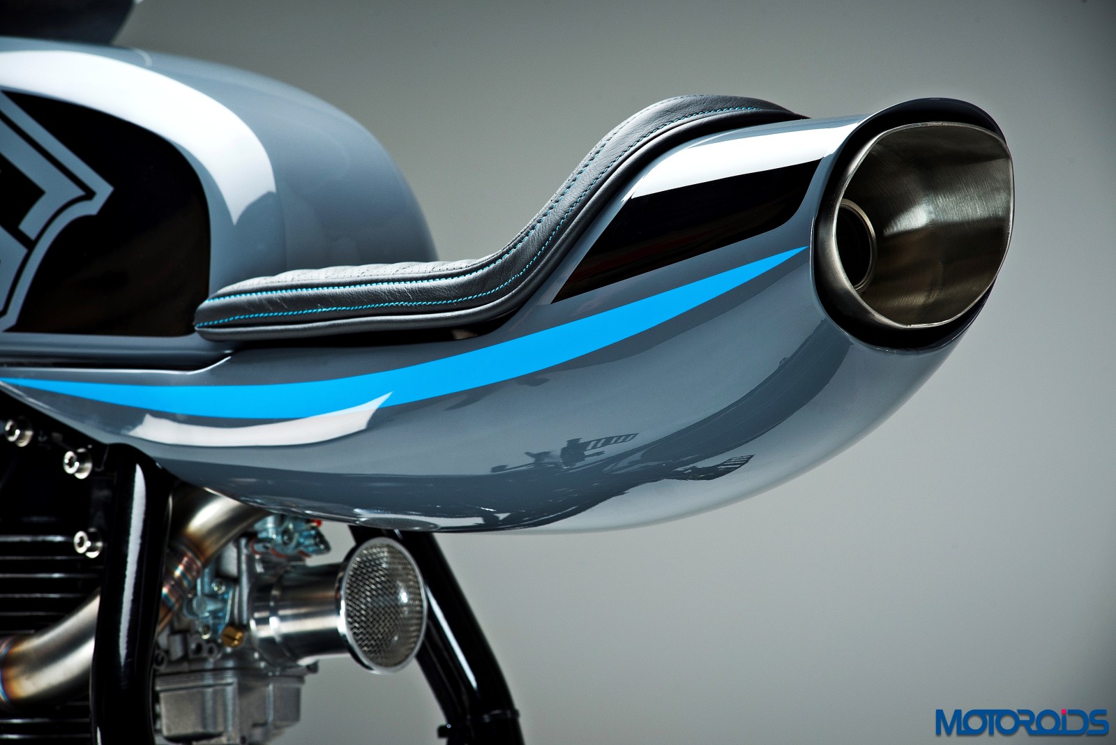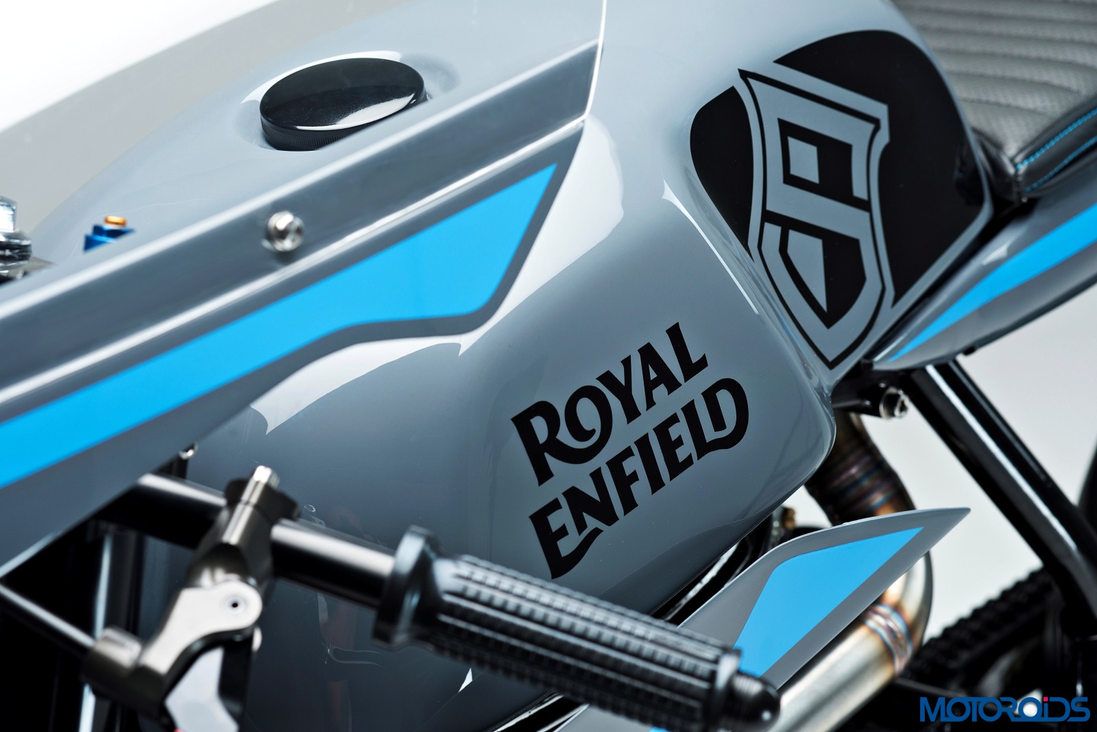 The Surf Racer strips down the Royal Enfield Continental GT to the essence of a cafe racer. Upfront is a new half fairing which improves the aerodynamics. The motorcycle is painted in metallic dark grey colour and gets contrasting highlights in the shade of blue. The fuel tank, along with the Royal Enfield tag, also dons Sinroja Motorcycles’ logo.