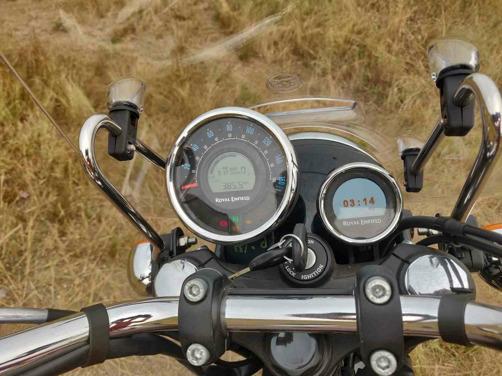 The all-new instrument cluster is now a split unit, where dial on the left incorporates an analogue speedometer and a digital display for fuel, two tripmeters and an odometer. The all-digital Tripper pod on the right shows time and pairs with the RE app on your phone to display turn-by-turn navigation in a manner which is never intrusive and all you see is just information which really matters. The mirrors might seem tiny in size but they do a commendable job of mirroring the view behind. The all-new control switches on the handlebar are designed well and relay a tactile feel to the rider’s digits. There’s a USB socket under the left-hand-side switchgear, which can be used to charge a device.