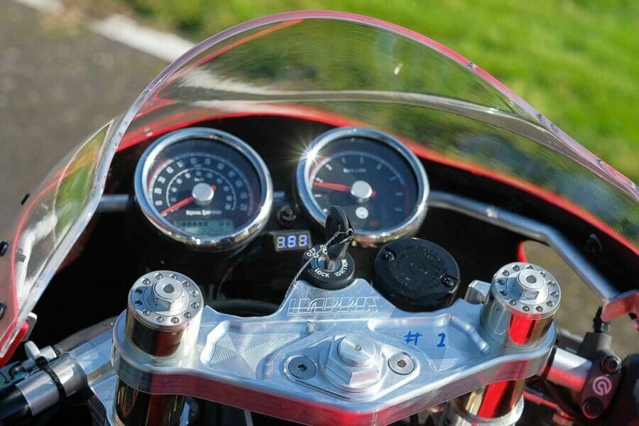 The chassis is suspended by Ohlins suspension, while high-quality Brembo brakes make sure it stops as well as it goes. Custom Harris yokes have also been integrated to remove weight, and the tank has been modified to accept a recessed Harris filler cap. Finally, the engine has been bored out and a 750cc S&S big bore kit has been installed. Below are the bike’s official specifications: