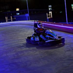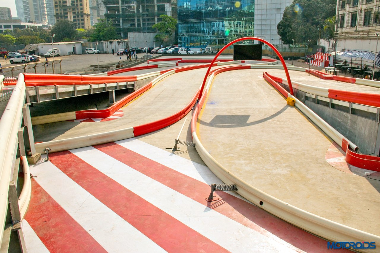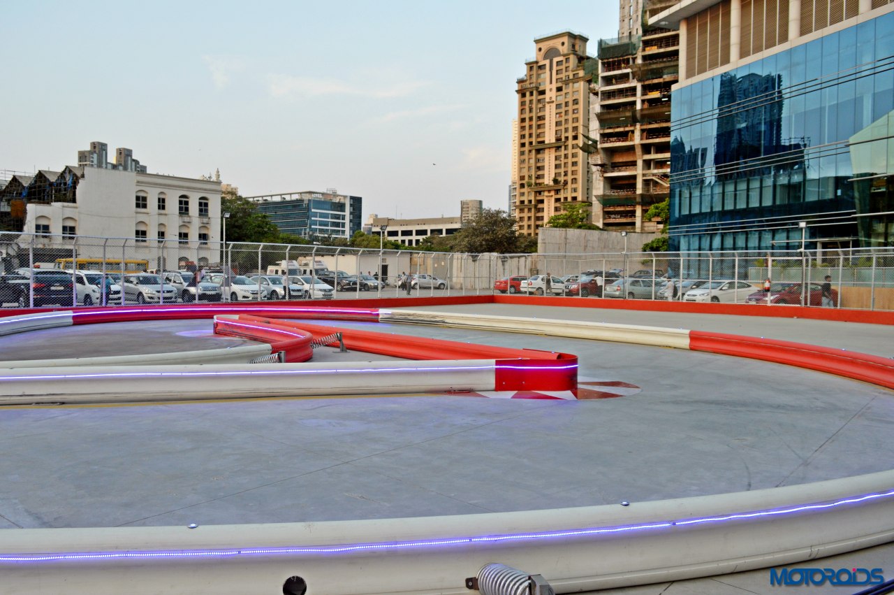 The length of the track stands at an impressive 430 meters (possibly the longest for such a setup in India). 300 meters of this length is on the ground level, with the remaining 130 meters being elevated. You get on to the track from the pits onto a sweeping left hander, followed by a tight right hander leading you into a left-handed hairpin bend opening up the sight of the start-finish straight. Immediately after the start finish straight, you get a hairpin that leads you onto the elevated level into an Omega shaped curve, after which you descend back onto the ground level. The downhill straight calls for some hard braking as you’re barrelling down in a small kart, and might end up into the barriers if not careful. The section ahead is the most exciting of the entire layout, and allows you to induce an intoxicating sideways drift to emerge onto a straight that leads you into the covered area of the track. An S bend follows, leading you into the sweeping curve you emerged onto the track from.