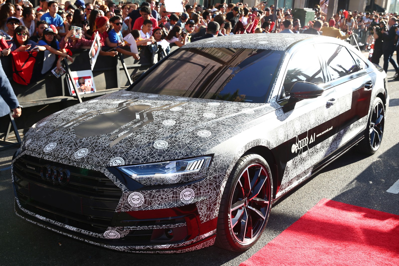 The new Audi A8 is scheduled to be unveiled on on July 11, 2017 at the Audi Summit in Barcelona. Normally, Audi’s Technical Development team conceals their prototypes with a special adhesive foil with a camouflaged pattern of black and white swirls. However, this time Audi Design developed a new camouflage foil with a Spider-Man design specifically for the appearance on the red carpet at the world premiere of ‘Spider-Man: Homecoming’. The traditional swirl design has been modified to incorporate spider webs on the vehicle doors and within the signature rings.
