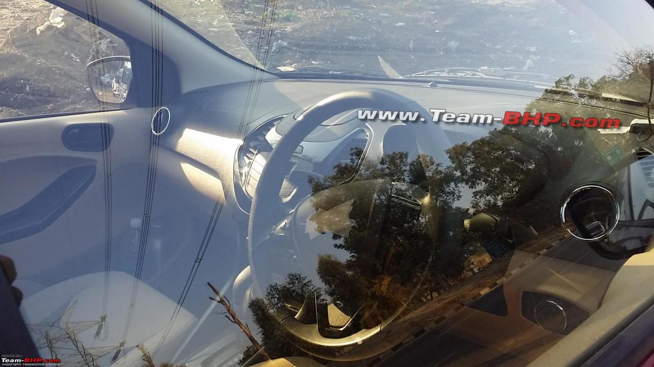 While it isn’t clear if the same will also find its way into the Aspire sedan, Ford might not or might just offer a double clutch transmission unit on the new Figo. If that happens, the Figo will become to cheapest hatchback to come equipped with that piece of technology. Wearing steel wheels, the car in the picture appeared to be a mid-level variant and featured equipment like steering mounted controls, an integrated entertainment system, electric mirrors, piano black inserts on the wheel, the dash and chrome inserts around the vents and the headlamp switch.