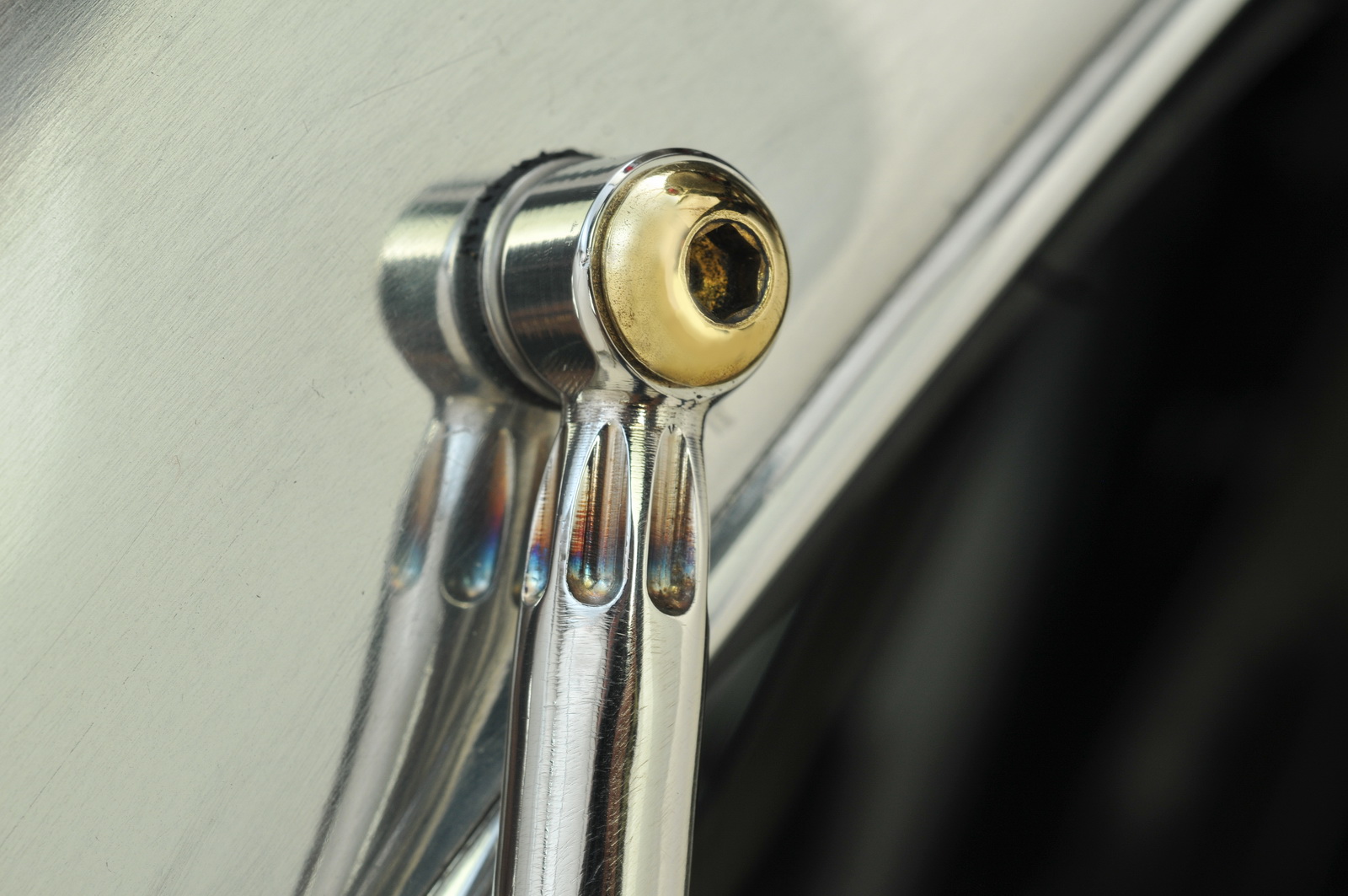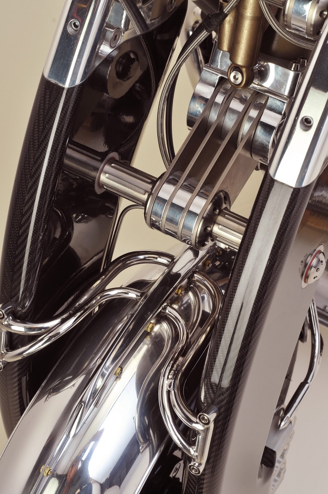 The girder front-end and rear swingarm feature nearly-identical carbon composite blades with built in adjusters which allow for a change of trail at the front, and serve as chain adjusters at the rear, and are adjustable via a small worm gear. The Legacy’s leather seat is supported by a structure consisting of six titanium blades, while patches of leather on either side that could be potential heat shields can be seen giving company to the upswept exhaust cans.