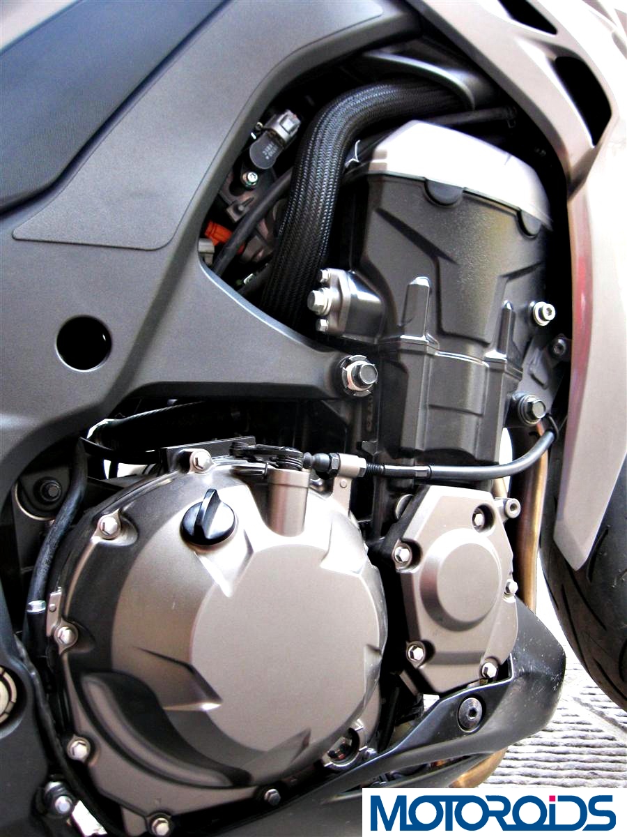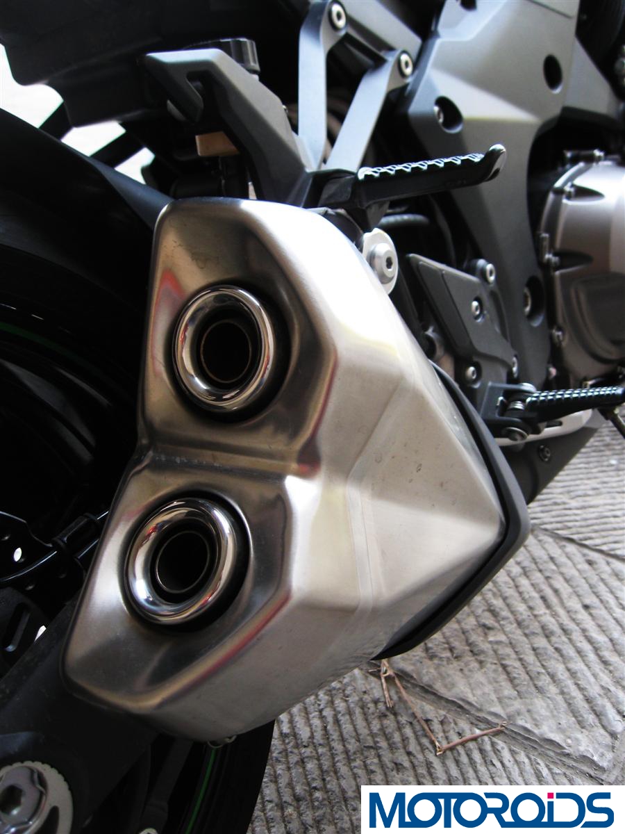 Thrusting the 2014 Kawasaki Z1000 is a liquid cooled 1043cc inline four engine- the same motor that powers the 2014 Kawasaki Ninja 1000 (read our review here). Treated to revised ECU settings and camshaft timings, connectors between the header pipes and new cylinder connecting passageways, the Z produces improved punch in the mid and higher rev range. The power and torque figures might be similar to the N1000 reading 140 bhp @ 10,000 rpm and 111 nm @ 7300 rpm respectively- but the Z is a different animal here.