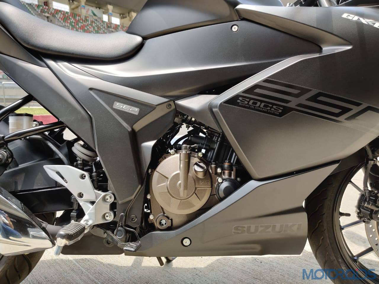 At the heart of the Suzuki Gixxer SF 250 is a 249cc, oil-cooled, SOHC, 4-valve, Fuel injected engine which cranks out 26.5PS @ 9000rpm and 22.6Nm @ 7000 clicks. All that is sent to the rear wheel via a 6-speed gearbox and the bike tips the scales at 161 kilos (Kerb). Keeping the engine’s temperature in check is a jacket-like design which cools the oil which circulates around the motor.