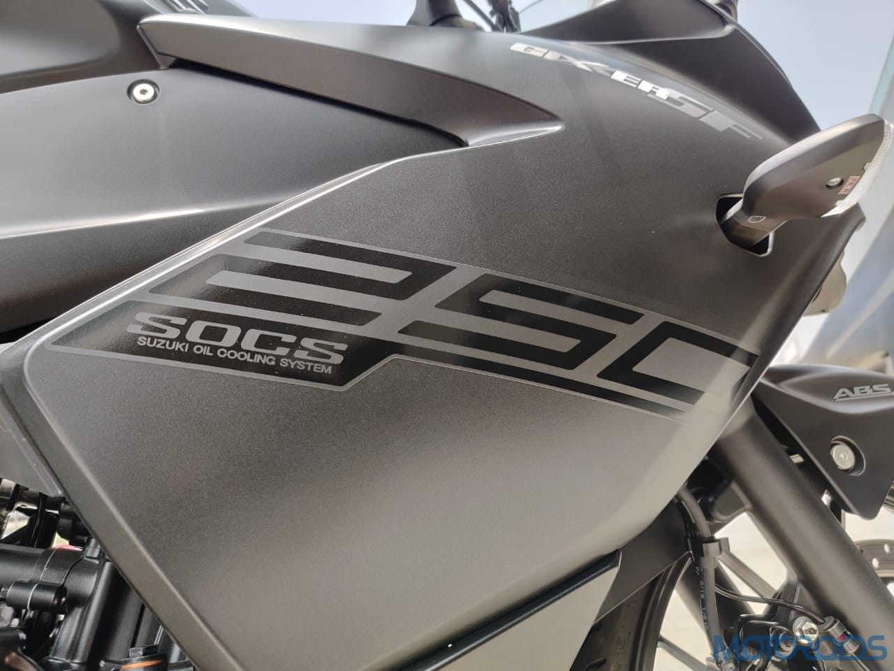 The front wheel’s rake angle isn’t all vertical and those wide mirrors talk about the Gixxer SF 250’s fast-touring credentials. Unlike what the SF (Generally Semi-faired) in the name suggests, all mechanical components are covered under bodywork which is only available in two colours – Matte Black & Silver. Since the 250 is identical in appearance to the 155 SF, the differentiating factor here is the stickering work and the gloss in the 155’s paint.