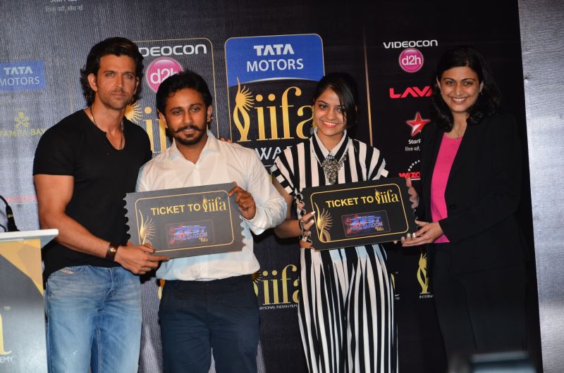 — Superstar Hritik Roshan, winners of the Tata Motors’ Zest for Stardom Contest-Mr. Himanshu Singh and Ms. Pallavi Kalra and Ms. Delna Avari, Head-Marketing Communications, Passenger Vehicles, Tata Motors at the International Indian Film Academy (IIFA) press conference in Mumbai