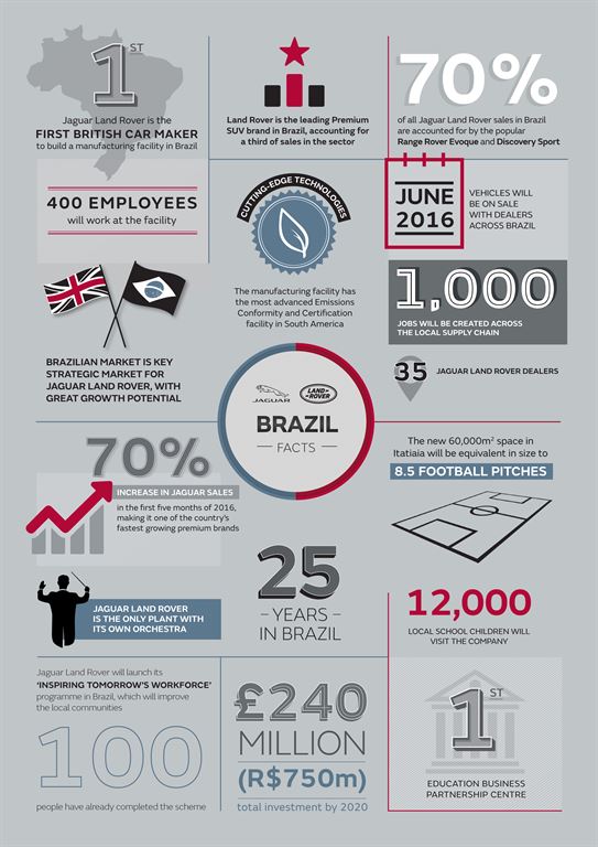 The Brazilian plant is a part of the 240 million pound ($350 million) investment announced 2013 for the world’s ninth-largest economy. The British firm will build both its Land Rover Discovery Sport and Range Rover Evoque sport utility vehicles at the plant, which has a maximum capacity of 24,000 vehicles but is slated to produce less than 10,000 units this year.