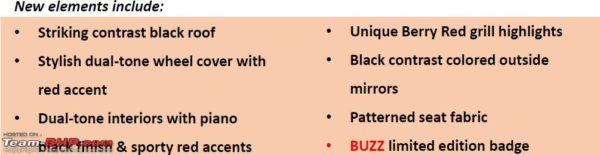 As mentioned in the leaked image, the Tigor Buzz edition will come equipped with a Berry red highlight for the front grille, contrast black roof and ORVMs, new dual tone alloy wheels with a red accent and a ‘Buzz’ limited edition badge on the outside. Inside, the model will come equipped with dual tone interiors with paint black finish and red accents as well as a new patterned seat fabric.