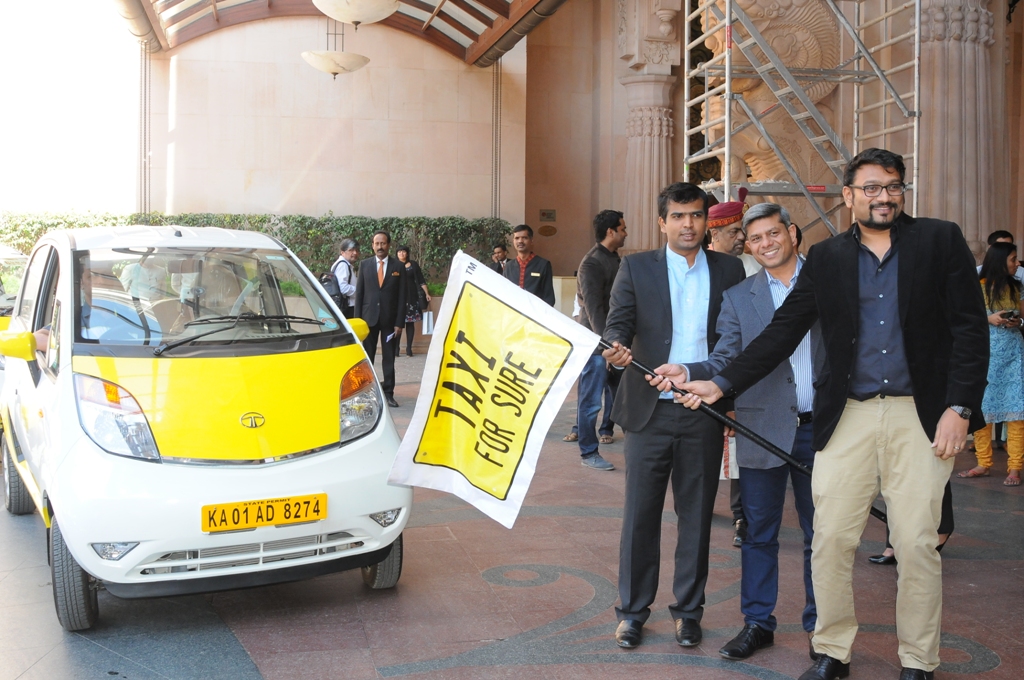 Co-founders of TaxiForSure, Ragunandan G (L), Aprameya Radhakrishna (R) & COO Arvind Singhal (centre) flagging off the fleet