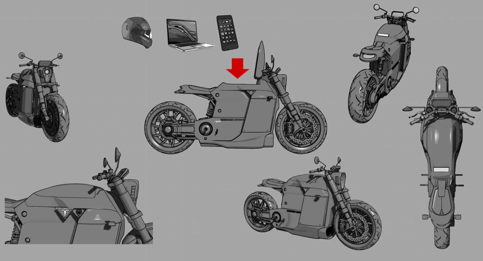This Model M concept is powered by a 150kW electric motor, fed by a stack of lithium-ion batteries mounted as low as possible within the aluminium frame to keep centre of gravity as close to the ground as possible. The Model M can be ridden in four computer controlled modes: Race, Cruise, Standard, and Eco.