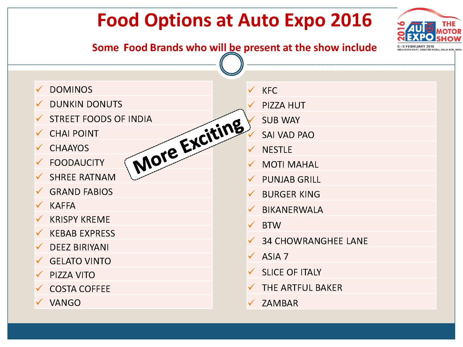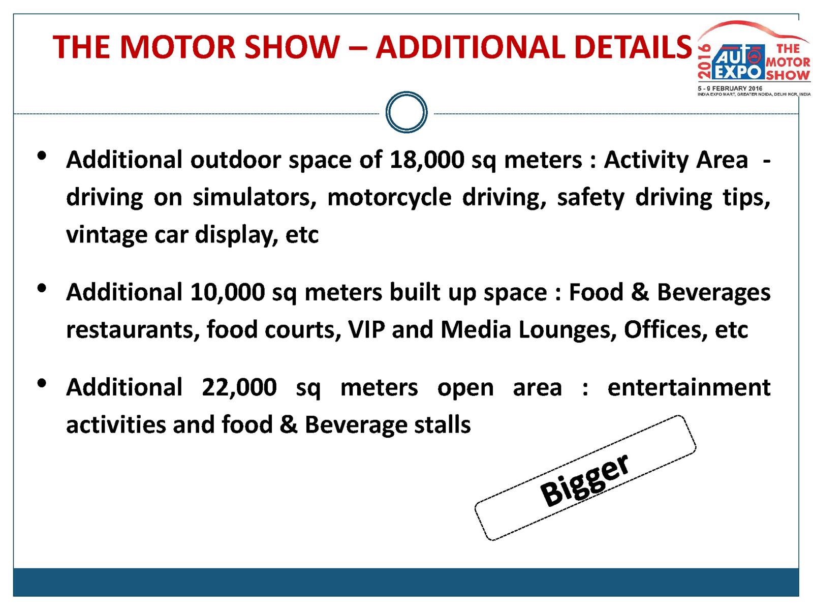 In addition to the vehicle showcasing by manufacturers, also on display would be high end Bicycles, Tyres and Tubes, Oil Companies, Automotive Design and Technology, Engineering and IT for Automobile Companies, Institutions, Universities, Auto Insurance Companies, and Media & Auto Portals/ Publications. Also a pavilion is being put in place for vintage cars and activity area for safety riding, driving simulators, etc.