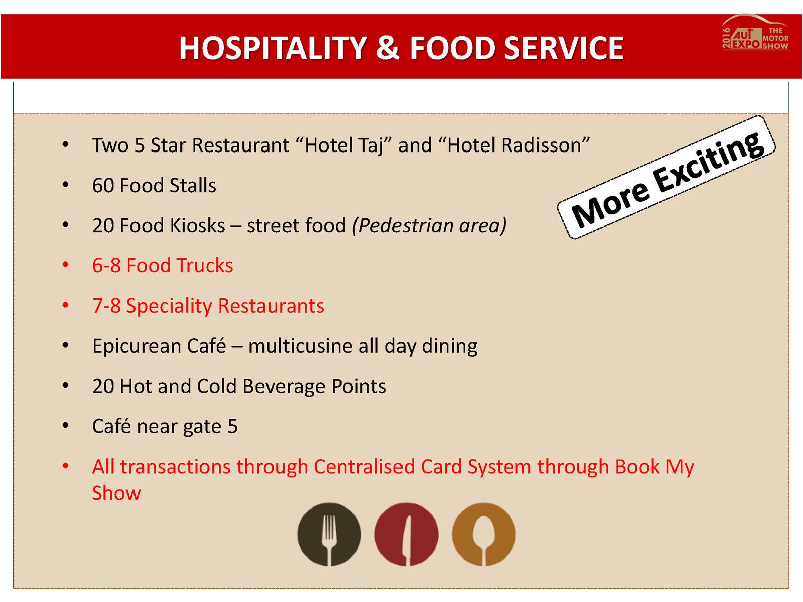 Hospitality and food services would be taken care by 60 food stalls, 20 food kiosks, 6-8 food trucks, 7-8 specialty restaurants, a multi-cuisine Epicurean Café, 20 beverage points and 2 Five Star restaurants by “Hotel Taj” and “Hotel Radisson” .