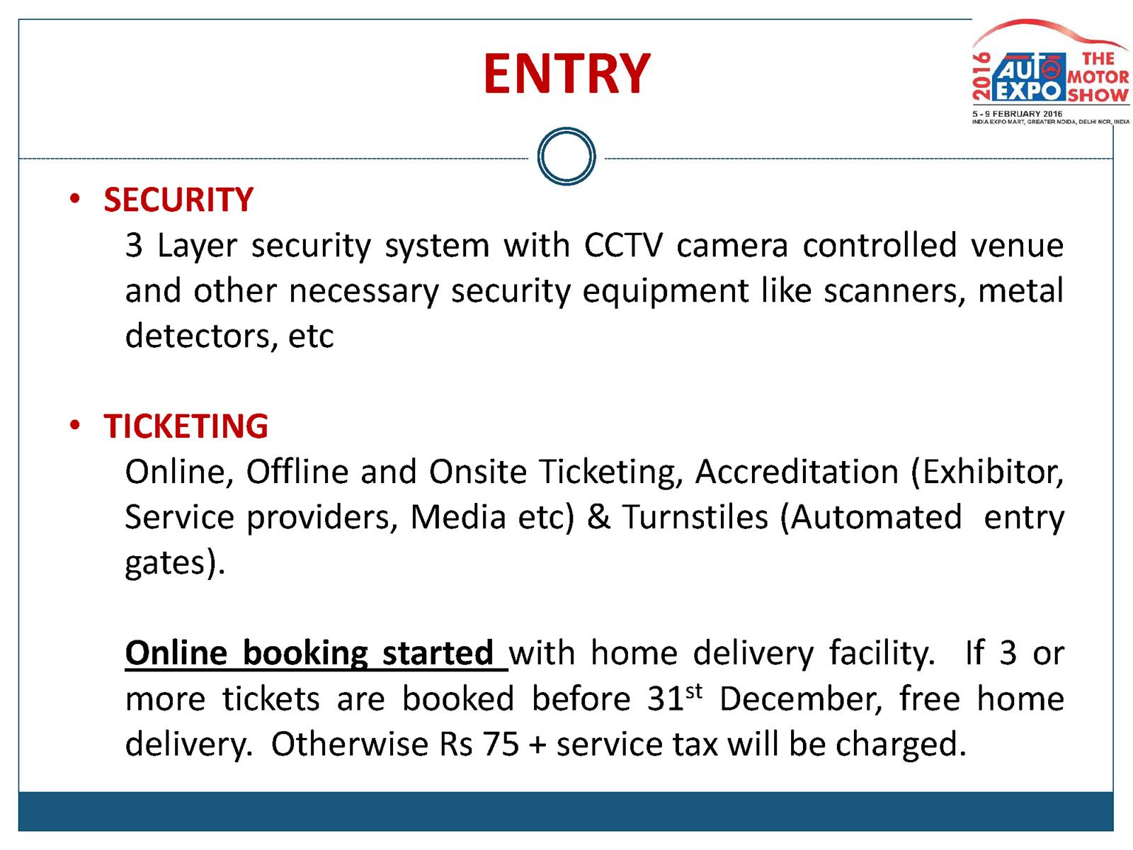 Bookings for 3 to 10 tickets if made before 31st December 2015 would be entitled for free home delivery. Regular home delivery charges for any lesser bookings would be charged at INR 75 per booking till 25th January 2016. Visitors can also collect their ticket directly from exchange counters located at the parking lot near the venue in Greater Noida.