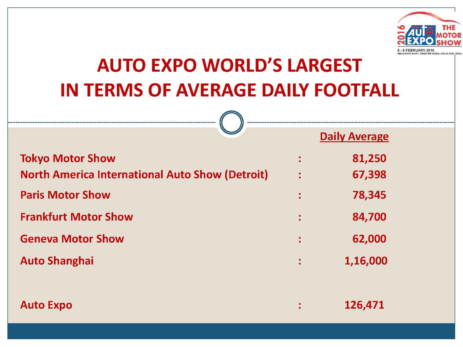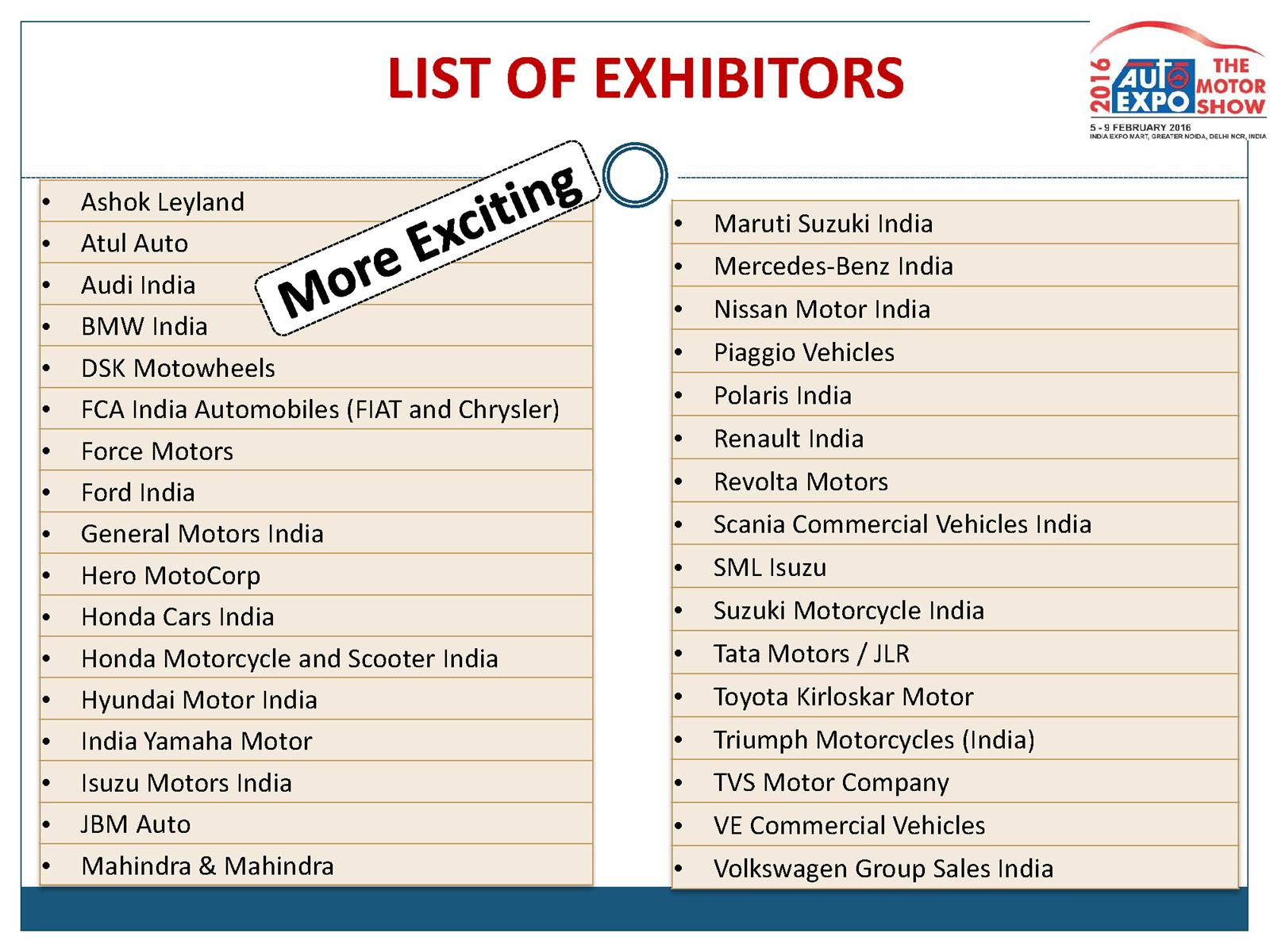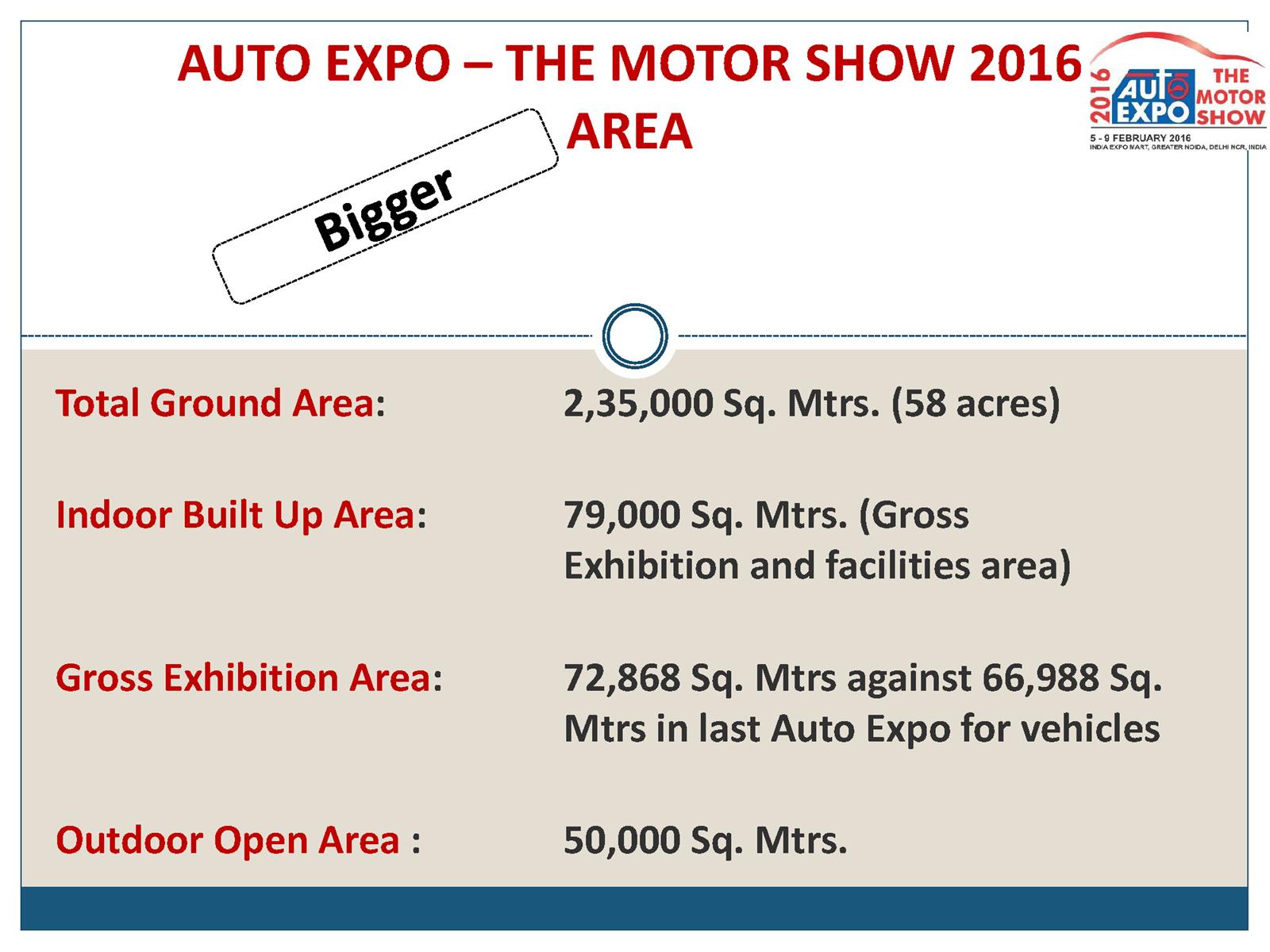 The 13th edition of the Indian Auto Expo aspires to be `Bigger, Better and More Exciting’. The gross indoor exhibition space now stands at completely air conditioned 68,000 sqms against 62,000 sqms of last year. The 2016 Auto Expo will see 65 exhibitors stage their products against 55 in 2015. Vehicle manufacturers such as Ashok Leyland, Audi India, BMW India, Datsun, Fiat India, Ford India, General Motors, Honda Cars India, Hyundai Motor India, Isuzu Motors India, Jaguar Land Rover, Mahindra & Mahindra, Maruti Suzuki India, Mercedes-Benz India, Nissan Motor India, Renault India, Scania Commercial Vehicles India, SML Isuzu, Tata Motors, Toyota Kirloskar Motor, VE Commercial Vehicles, Volkswagen India etc. to name a few. Two wheeler manufacturers participating at the expo would be Hero MotoCorp, India Yamaha, Mahindra 2 wheelers, Piaggio Vehicles, Suzuki Motorcycle India, Triumph Motorcycles India, TVS Motor Company etc. The Auto Expo 2016 would also see Abarth, BMW Motorrad, Jeep, DSK Benelli and Indian Motorcycles throng the space at the exposition for the first time.