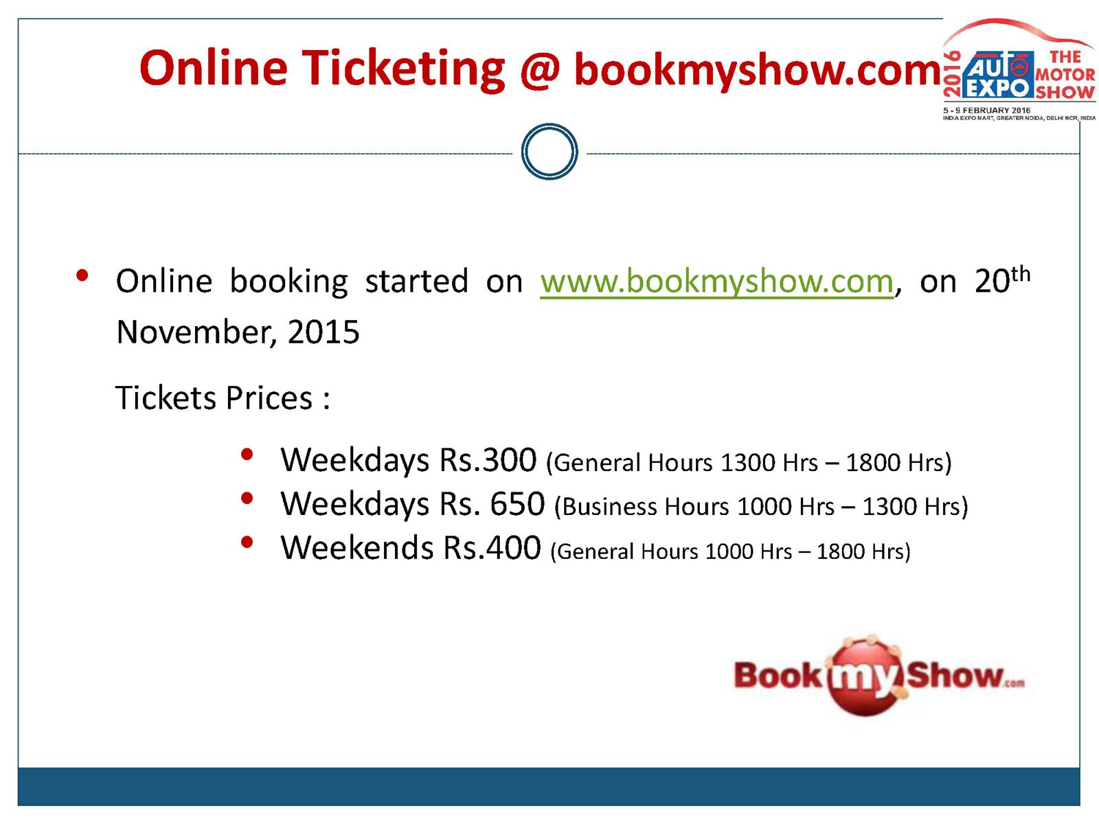 Tickets to the Auto Expo 2016 can be booked online at the Auto Expo Website and BookMyShow. The ticket prices are as follows: