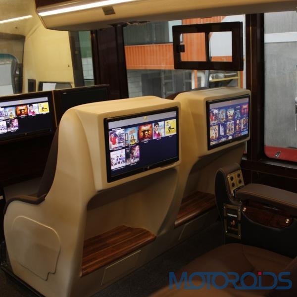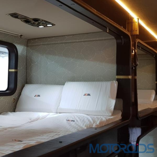 The Destiny coach boasts of some high-end cabin features and high-quality exteriors. The coach has ergonomically designed seats that provide greater comfort and relaxation with the push of a button for incline and recline. It has 18 reclining berths and 9 business class executive seats, all of which provides a personalized experience and comfort. Every berth cabin is furnished with blinds for privacy and offers a personal space. Moreover, all seats are geared with a USB port to charge electronic gadgets and a 19″ LED Screen with top-quality headphones for personalised entertainment. Seats are also equipped with a customized sliding table which can be used for working on the laptop or having meals.