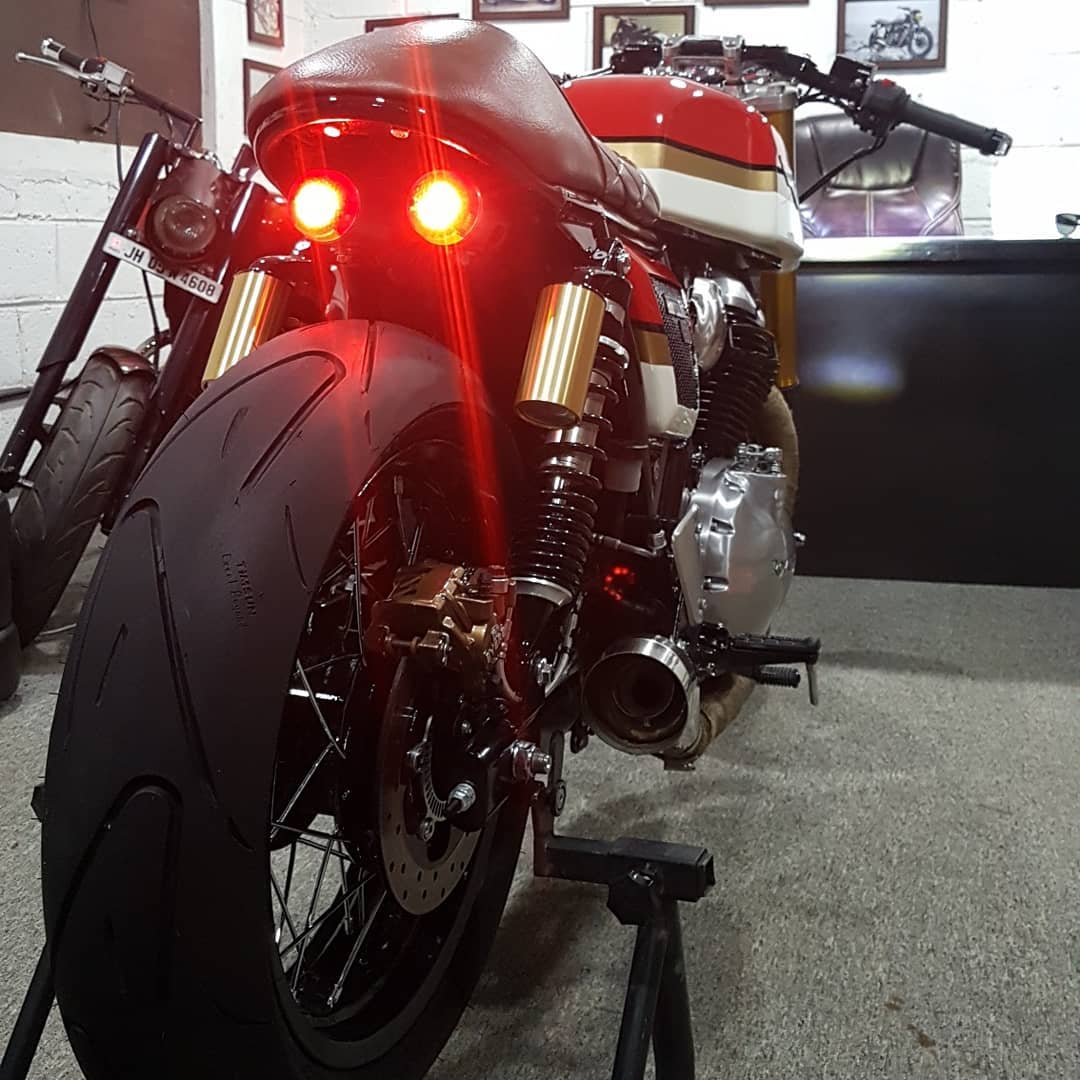 At the back, the rear spoke-type rim too is blacked out and has been wrapped in fat, sporty rubber which has a profile that should allow for some serious lean. We like how the rear taillights have a retro-robot appeal about them and add more character to this luscious build. Looking at this transformation we can only wish that some sense prevails somewhere for the authorities to bring some changes to draconian and stone age laws which hold people back from personalising a machine in India. It’s an expression for many, doesn’t harm anyone (okay annoyingly loud exhaust systems are a nuisance we agree too), and only creates an avenue for passion-filled folks to keep themselves happily busy.