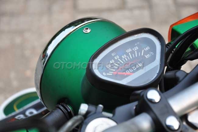 A Bajaj Pulsar 180 handlebar replaces the stock clip-on which now offers an upright riding position. The footpegs too have been moved forward for relaxed ergonomics. The contrasting single piece seat replaces the split-seat setup, adding to the retro look of the motorcycle. The rear part of the chassis too has been modified to offer a flatter seat and the old-school U-shaped pillion grab bar.