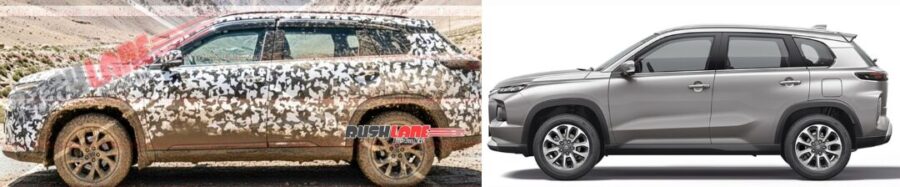 The test vehicle seen at high altitude has an obvious longer body than the current Hyryder available in India. The rear section is stretched, the proportions appear larger and the overall stance suggests a correct third row. This gives the impression that Toyota and Maruti Suzuki have resumed development of their three row midsize SUVs from a brief hiatus.