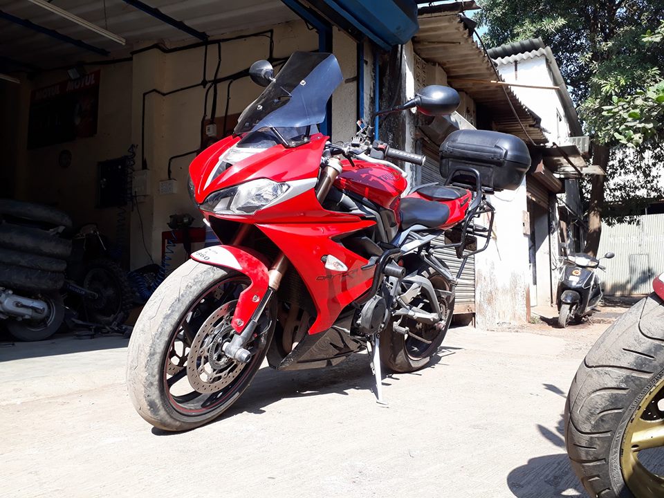 Taking a supersport out for touring isn’t the smartest of decisions but the folks at Sahyadri Moto gave Triumph’s middleweight apex hunter a major overhaul to turn it into a mile muncher. The red Triumph Daytona 675 in the images gets an extensive list of accessories that can help the rider travel for hours with relatively less fatigue, and more comfort.