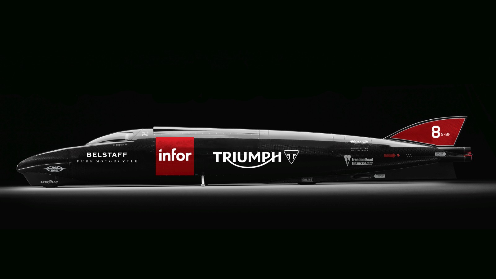 The Triumph Infor Rocket features a carbon Kevlar monocoque construction with two turbocharged Triumph Rocket III engines producing a combined 1,000 bhp at 9,000 rpm. The motorcycle is 25.5 feet long, 2 feet wide and 3 feet tall. Powered by methanol fuel, the bike is competing in the Division C (streamlined motorcycle) category.