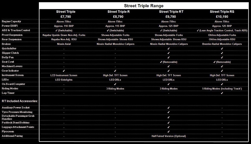 According to the survey list, the Triumph Street Triple range would be divided in four parts: Street Triple, Street Triple R, Street Triple RT and Street Triple RS. All the motorcycles, as said in the survey list, would be above 750cc. The models would have varying power output and features depending on the positioning and price.