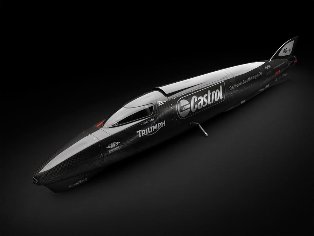 The 25 feet long Triumph Rocket Streamliner is a project of Hot Rod Conspiracy and Carpenter Racing in collaboration with Castrol Motorcycle and Powersports Products. Powered by Methanol fuel, the Streamliner uses a Carbon Kevlar monocoque construction running on custom made suspension by Hot Rod Conspiracy and Goodyear Land Speed Special Tyres.