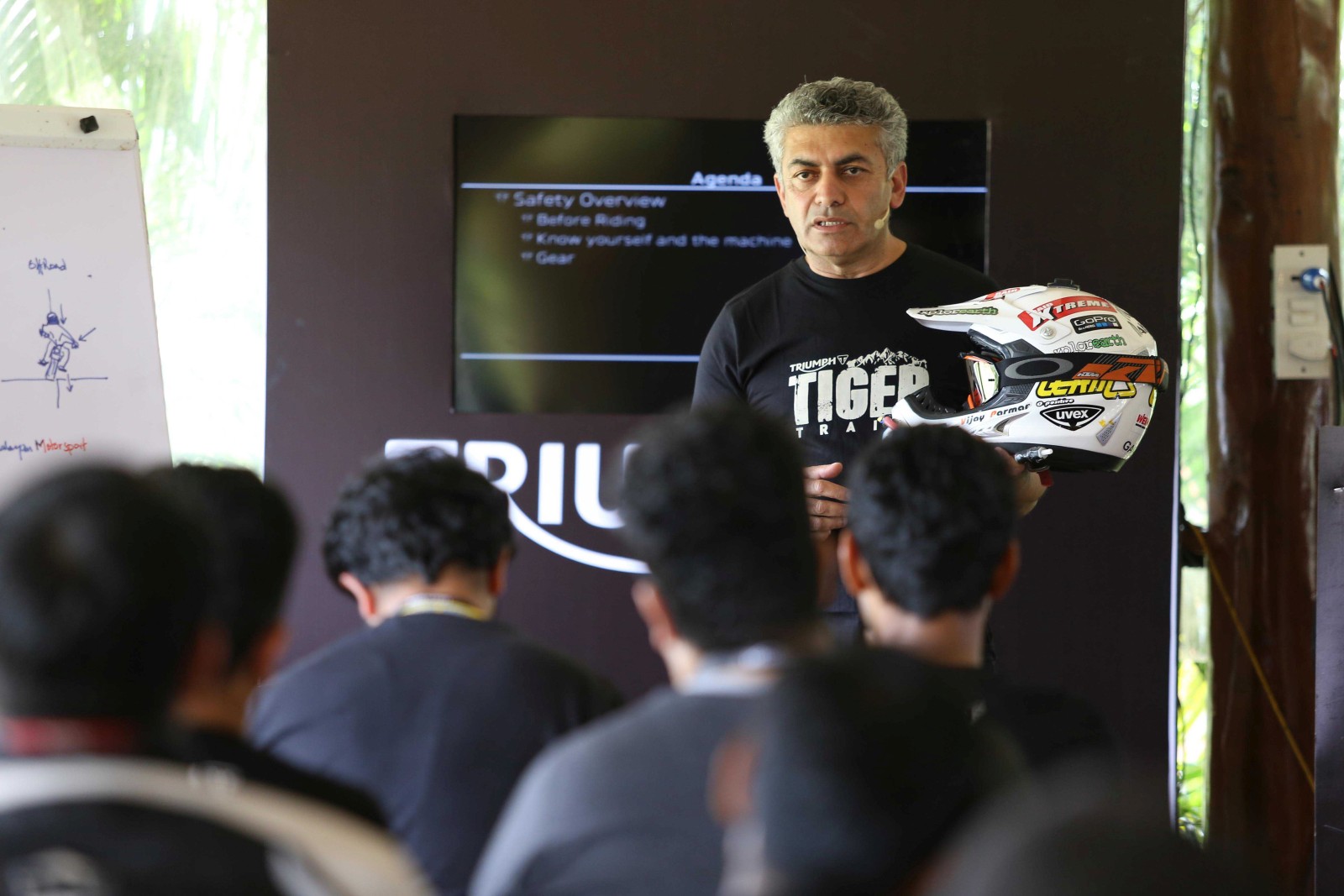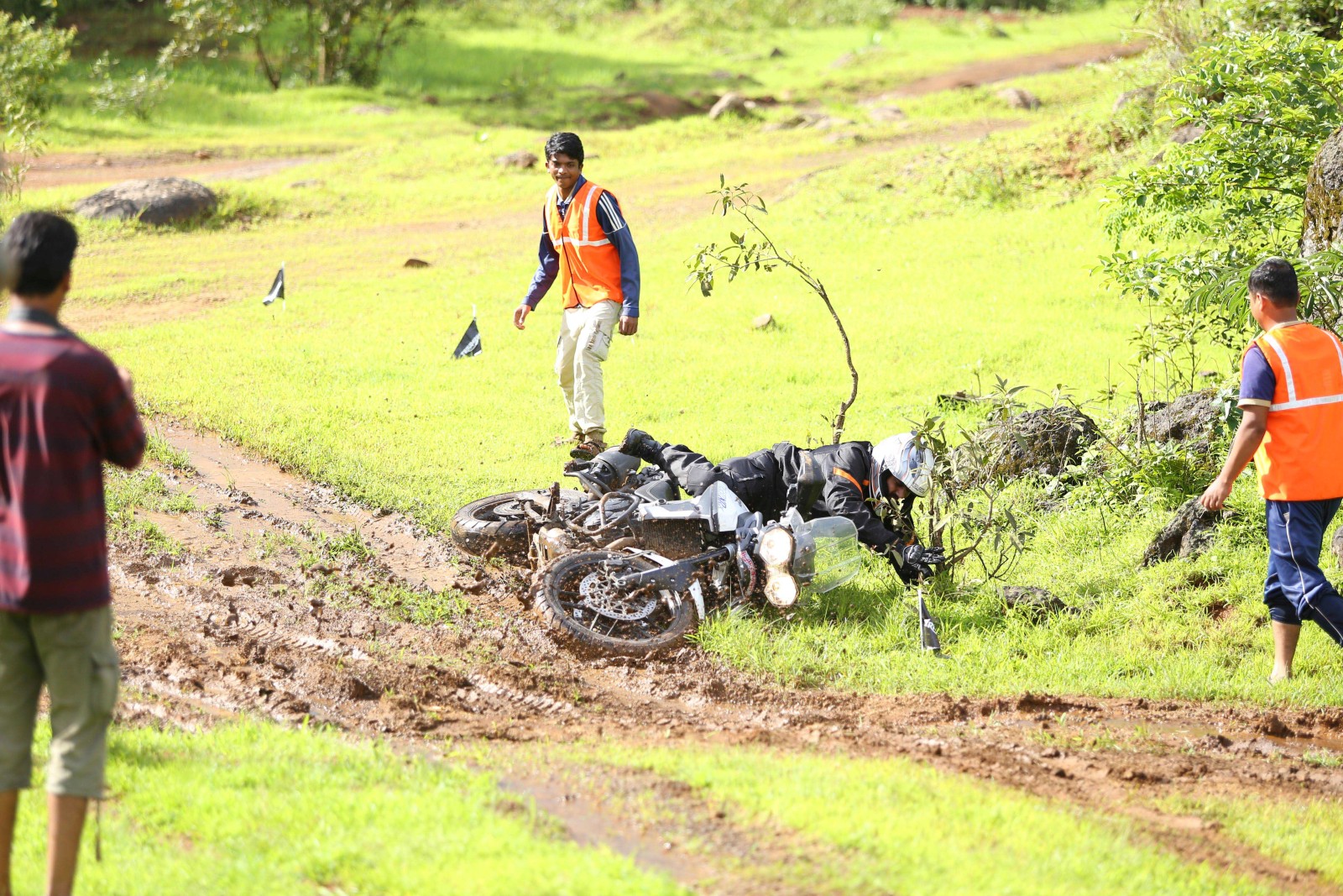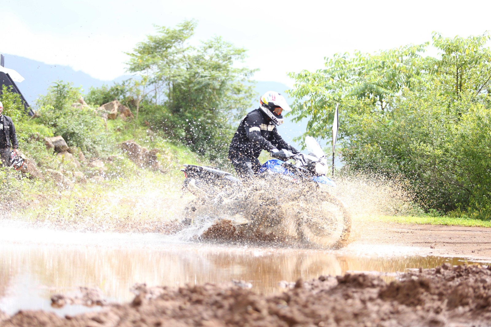 With the safety briefing and riding tips out of the way, we headed out to explore the specially-designed trail on foot to understand the terrain. The training comprised of manoeuvring, water-wading, riding on incline surfaces and through muddy terrain. Unlike tarmac, off-roading involves a different style of riding. So instead of leaning into a turn, as you’d do on a regular day around a canyon, you’d have to take your body on the opposite side of the lean. Here’s a graphic that’ll help you understand the technique – left is for road/track riding while right is for off-roading.