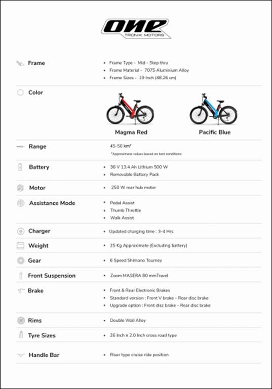 Delivering an efficient and exciting commuting experience, TRONX ONE also features a smart display powered by tronXTM and comes with an integrated tbike app which allows the rider to estimate range, and set fitness goals, all from the smartphone. Easy to not just ride but use, the lightweight and detachable 36 V 13.6 Ah Lithium 500 W battery along with a 250W rear hub motor delivers a power packed experience to the users. Tronx One Claims uncompromised Guaranteed range of 50 Kms on continuous throttle mode per charge and 70-85 Kms on electronic gear Assist Mode per charge.