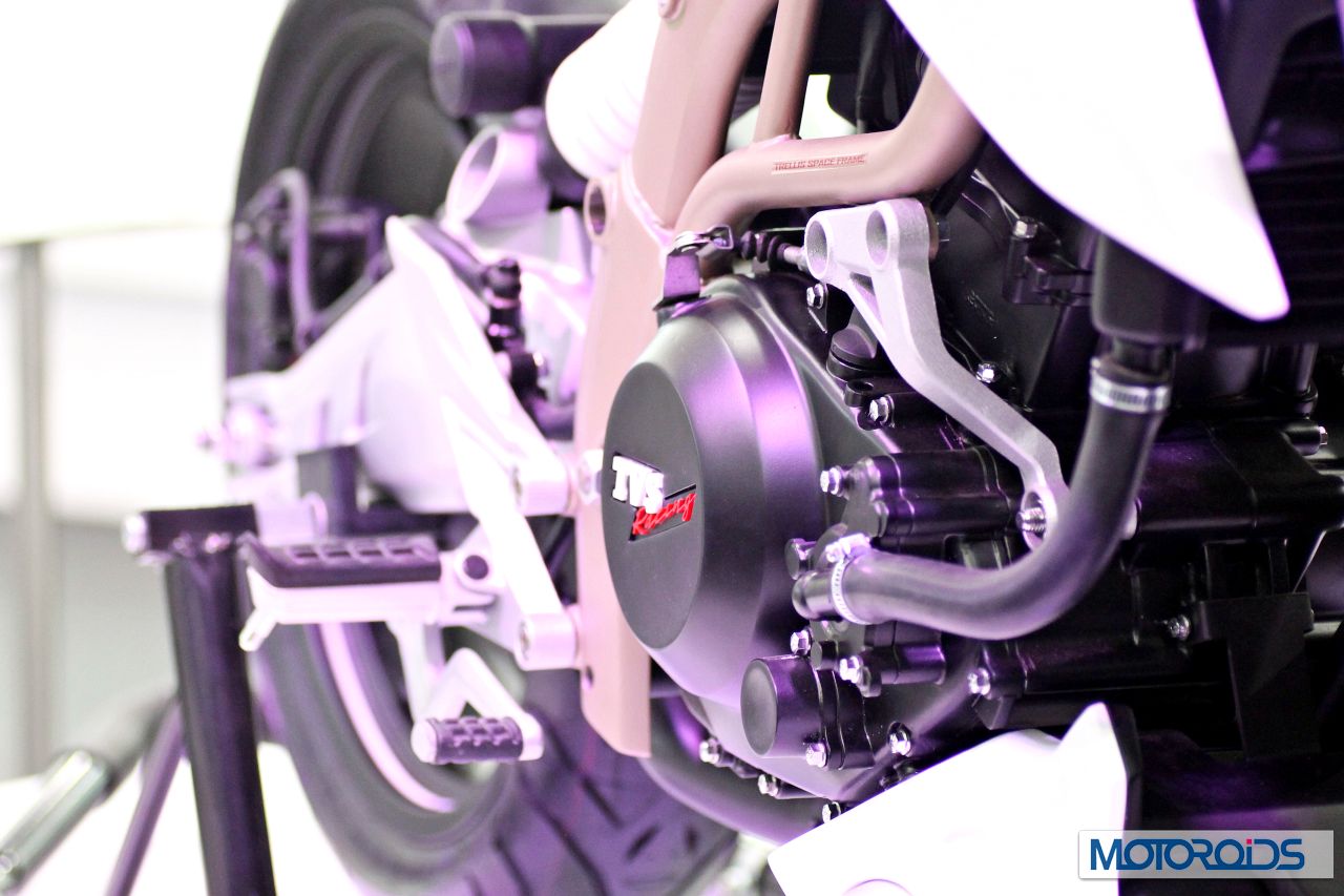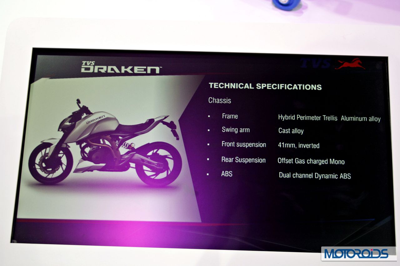 The TVS Draken is meant to be a 250cc concept motorcycle. Powered by a 249.2cc engine with liquid-cooling the TVS Draken is supposed to produce 38.50 bhp of power at 12,000 rpm and 23 nm of torque at 9500 rpm. The company is also claiming a fuel efficiency figure upwards of 33kmpl . The engine is mated to a 6 speed transmission.