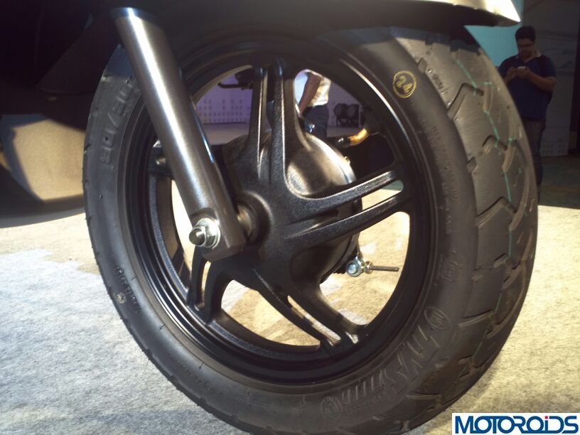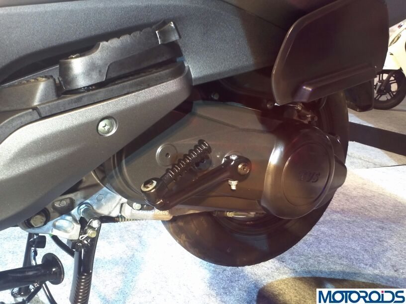 The Jupiter is shod with telescopic shockers at the front and gas charged rear suspension with the longest wheelbase of 1275 mm separating the 12 inch TVS branded tubeless tyres.