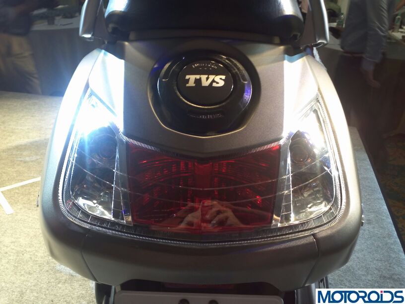 As visible in the picture, the TVS Jupiter misses out on a disc brake setup on its black coated wheels and utilizes drums at both ends for stopping power. The fuel lid positioning has been a surprise and is placed above the LED tail lamp- eliminating the need of getting off the scoot and raising the seat while refueling the Jupiter’s 5 litre tank. 17 litres of underseat space is available to swallow a full face helmet and also boot in routine grocery purchases.