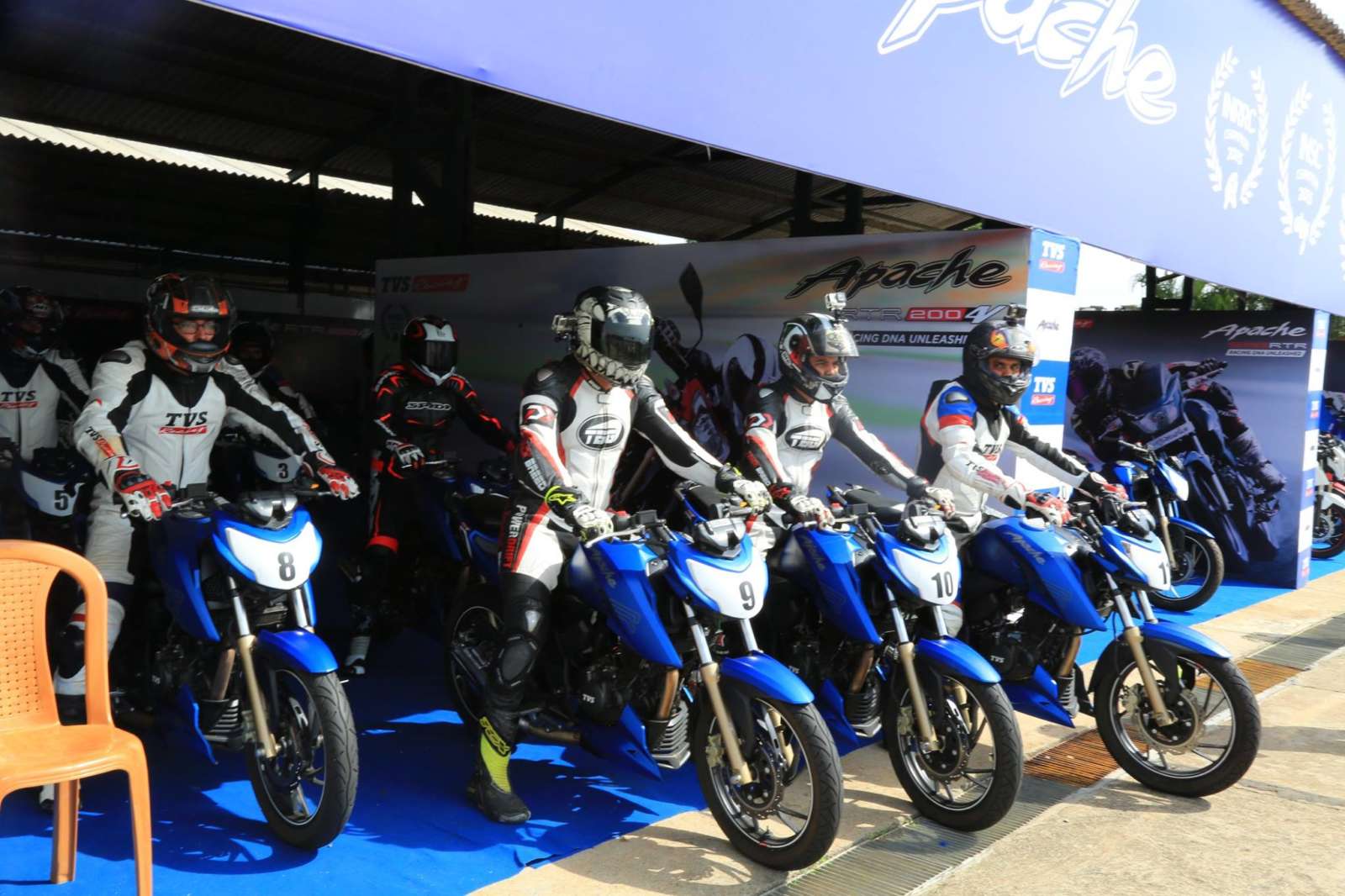 To get everyone into the heart of the action right from the word go-, it was a direct check-in at the track from the airport. The screaming exhausts of bikes whizzing past were already getting us anxiously await our stint on the track. A briefing session ensured that all the riders knew everything about the race control flags before getting onto the track. A few helpful riding tips along with precautions were good enough to get ourselves on the practice laps. We were given the new Apache RTR 200 4V for the TVS One Make Media Race in a tweaked avatar and at the same time retaining the look of the regular production motorcycle.