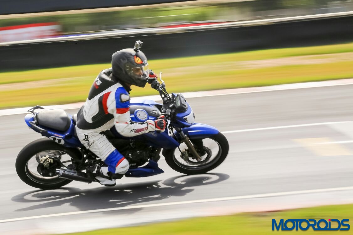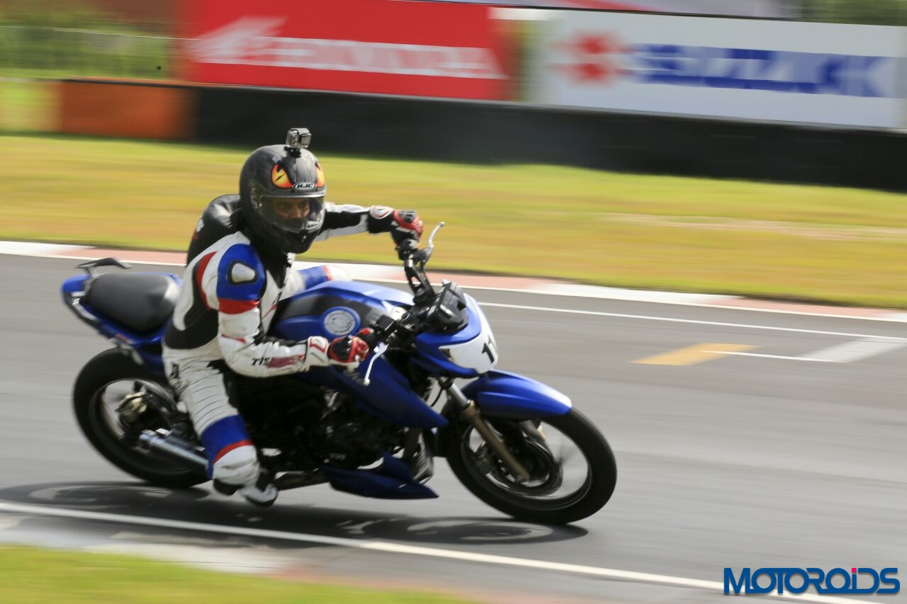 The new Apache RTR200 felt like a perceptibly different bike, as compared to the long term machine we have in our garage – the engine refinement, smooth shifting gearbox, fabulous brakes and sticky rubber at both ends, I was in love with the motorcycle on the very first lap. A street bike on track might invoke some raised eyebrows, but in all honesty, the RTR didn’t feel like a street bike at all and despite retaining the stock handlebars and suspension from the production RTR200- it felt like a track bike, a comfortable track bike if I have to define it. It would lean into corners with utmost ease feeling absolutely weightless – the tyres offered impeccable grip though I wished for a lower profile set. Also, elevated footpegs would have eliminated instances of peg-scraping- however hanging off slightly more than usual managed to address the issue. My liking for the motorcycle grew with the number of times I went around the 3.74 kms long MMSC track. The end of the practice session wasn’t a pleasant feeling as I was in love with the bike. I had to drop the bike in the pits with a heavy heart. This made the anticipation for qualifying and racing next day even more exciting.