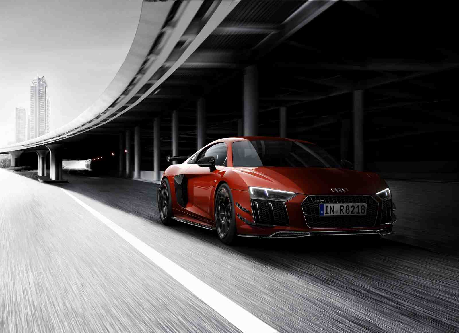 An aero kit developed in the wind tunnel and made exclusively from CFRP gives a harder edge to virtually every facet of the car, most notably the rear where a large fixed rear wing and diffuser with red elements dominate, while side skirts incorporating the Audi Sport logo and special aerodynamic elements located behind the rear wheel arches focus airflow. At the front, more pronounced air inlets, a deep splitter and sculpted canards reminiscent of those fitted to the first generation Audi R8 GT finish off the package.