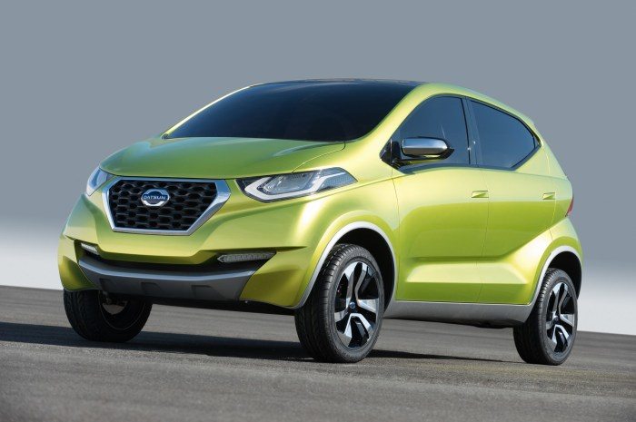 Unveiled at the 2014 Auto Expo, the “Redi-Go” is a micro-SUV based on an all-new Renault platform on which the XBA compact will also be based. The Redi-Go will feature a noticeably higher ground clearance to tackle rough road conditions. The wheelbase is 2,350 millimeters, and along with the short overhangs, 15-inch wheels, rear underrun protection elements and flared wheel arches give the Redi-Go a micro- SUV look. The design is centered around the unique, trapezoidal Datsun grille from the Go and Go+. Kerb weight is expected to be a light 760kg.