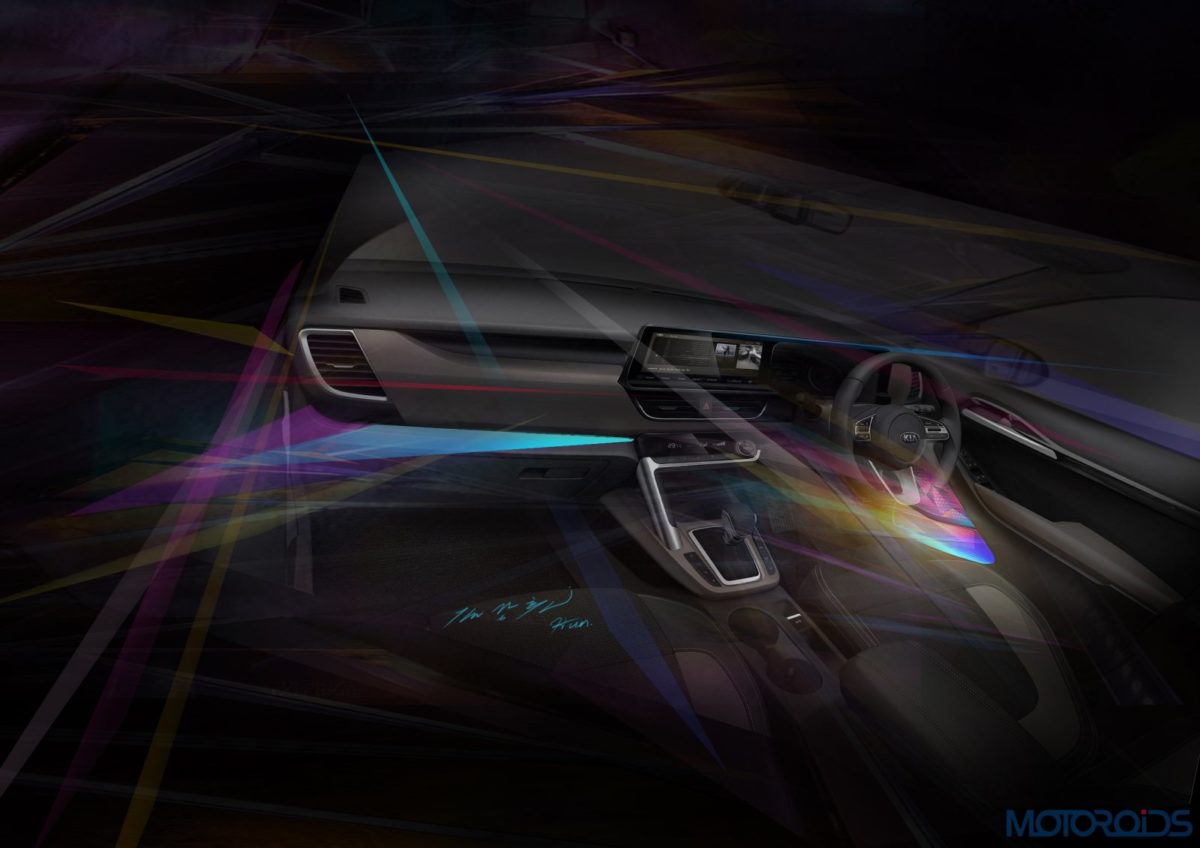 After releasing design sketches of its design, for the first time, the carmaker has shared cabin details of the Kia SP2i. In Kia’s own words, the Cabin is characterized by broad, sweeping shapes and sophisticated technical details. Aimed at pleasing the young-at-heart, tech-savvy buyers who look for a bold design statement, the SP2i’s feature list will include a 10.25-inch touchscreen for infotainment and Sound Mood Lighting. What’s that if you wonder? Our guess is that the ambient lighting will work with the sound system to create an atmosphere inside the cabin which could be uplifting, relaxing, energetic or you know how those shower gels advertise themselves.