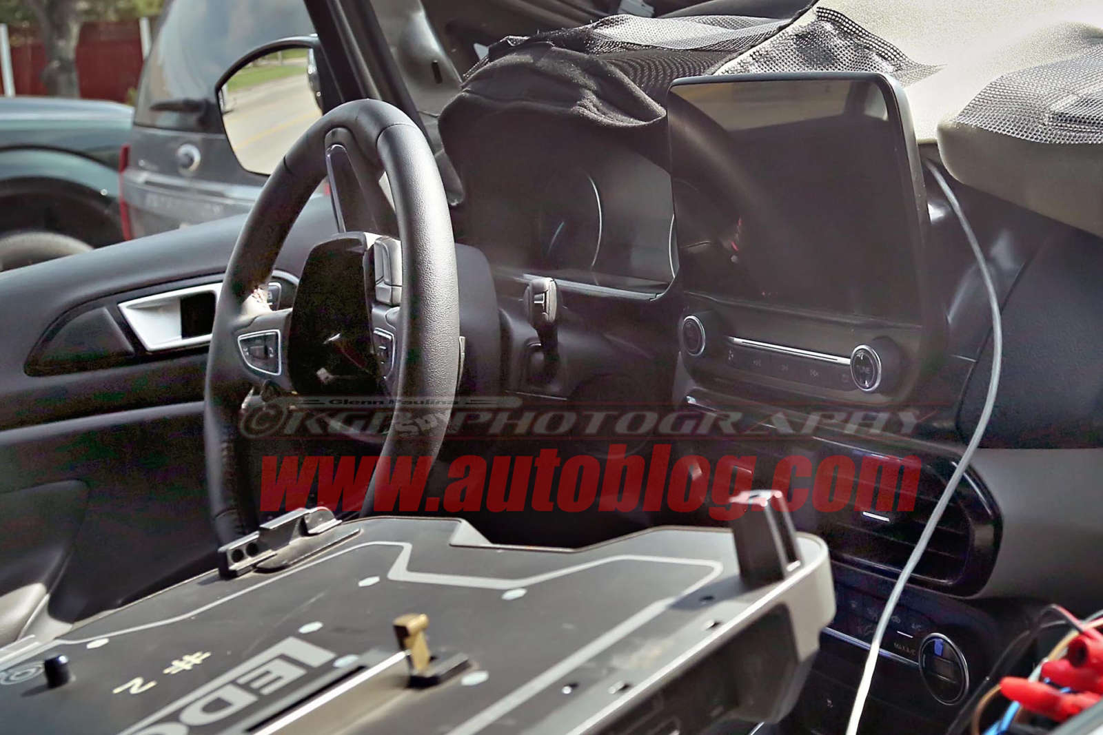 The 2017 Ford EcoSoprt’s interiors reveal a new, more upmarket dashboard. The new layout involves a stacked centre console that sandwiches its rectangular air vents between a fresh, touch-screen (finally) equipped infotainment system on top and the rotary controls for HVAC below. A dual tone colour scheme (beige + black) is highlighted with chrome and piano black elements, while the multifunction steering is also all-new. So is the instrument cluster, which has been redone with more flair than the one in the current model, with a fairly comprehensive MID between the speedometer and the tachometer. The side vents seem to continue unchanged.