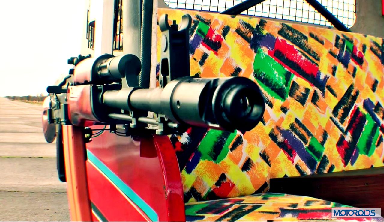 Colin seems to be obsessed with the ammunition laden tuk-tuk from the first person, action shooting game Far Cry 4, so on the side of the thing we have a pair of AK-47s- what the hell(!), while up front we get a pair of what appear to be Mini Uzis. And for when the scenario gets really serious, the twin RPG launchers on the roof will serve you well. Check all that in action in this positively wild video.