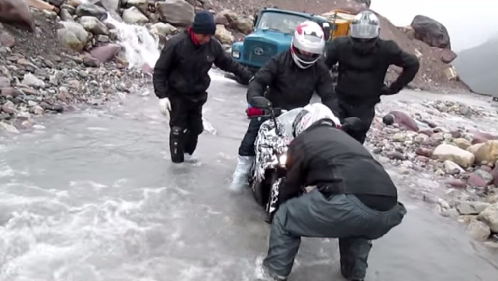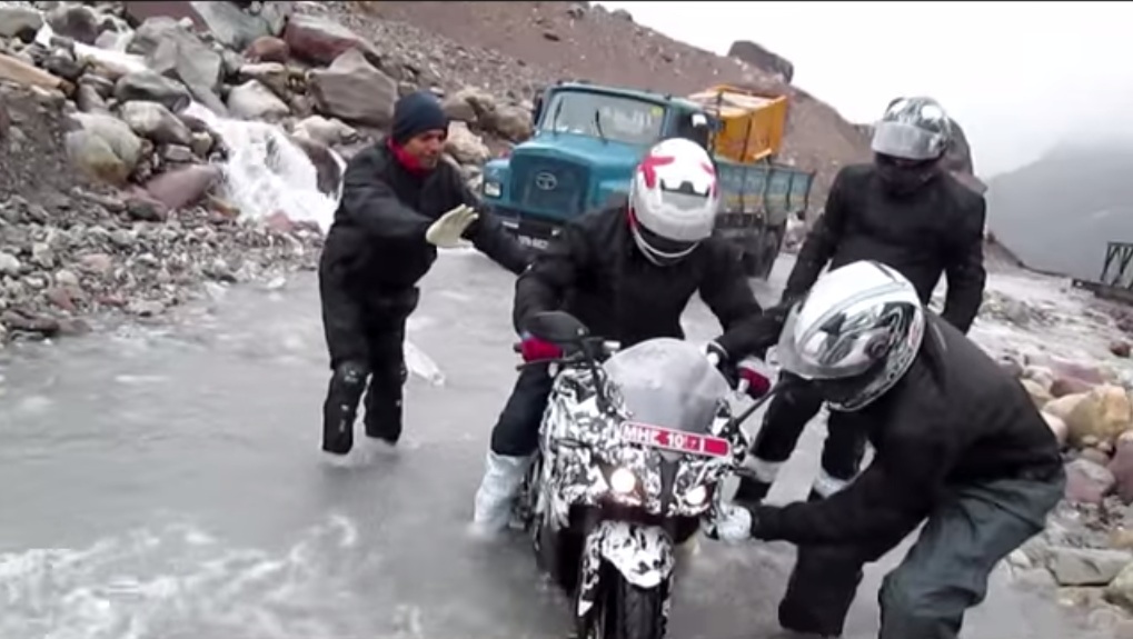 Bajaj has been testing its upcoming motorcycle, the Pulsar 200SS, thoroughly through various riding conditions of the country. One such test mule of Bajaj’s upcoming fully faired motorcycle was caught testing in the Bara-lacha Pass of the Himalayan range. Sadly though, the motorcycle got stuck on the rocky surface in a water crossing. Luckily for petrol heads, we got a good glimpse of the motorcycle once again as it crossed the stream.
